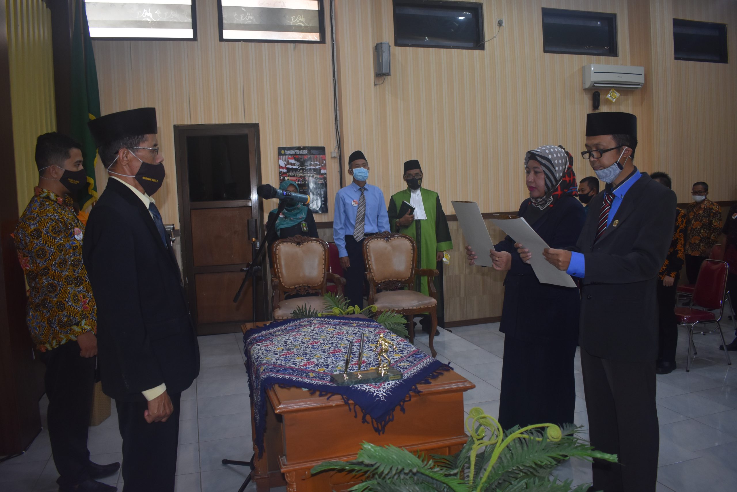 Kemudian dibacakan surat keputusan oleh Agung Wibowo, S.Kom Kasubbag Umum dan Keuangan Pengadilan Agama Pemalang dan dilanjutkan prosesi pengambilan sumpah dan pelantikan, bertindak melantik adalah Drs. H. Adroni selaku Ketua Pengadilan Agama Pemalang, sebagai saksi adalah Afif Eko Sulistiono,S.H selaku Panitera dan Mulyatun, S.H selaku Sekretaris serta sebagai rohaniawan adalah Slamet,S.Ag,M.H selaku Kasubbag Kepegawaian, Organisasi dan Tata Laksana Pengadilan Agama Pemalang. Setelah prosesi pengambilan sumpah dan pelantikan selesai, kedua pejabat yang dilantik membacakan Pakta Integritas sebagai komitmen jabatan baru di Pengadilan Agama Pemalang. Kemudian iringan musik Bagimu Negeri mengisi ruangan Sidang Utama menambah suasana semakin khidmat.