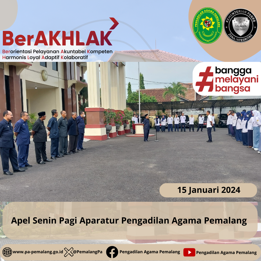 Apel Senin pagi Aparatur Pengadilan Agama Pemalang di Pimpin oleh Wakil Ketua Pengadilan Agama Pemalang Drs. Husaini, S.H.,M.H selaku Pembina Apel. Dalam Amanatnya beliau berpesan untuk tetap berdisiplin dalam melaksanaka setiap pekerjaan. Dan juga mengingatkan kepada Tim ZI untuk mempersiapkan kelengkapan data di tahun 2024 ini untuk memenuhi target untuk bisa meraih predikat WBBM.