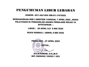 Pengumuman Pengumuman Cuti Bersama & Libur Lebaran Pengadilan Agama Pemalang Kelas 1A Tahun 2022 Read More » April 28, 2022