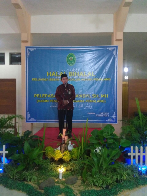 Pemalang,07 Juli 2017. Pengadilan Agama Pemalang mengadakan acara Halal Bihalal Keluarga Besar Pengadilan Agama Pemalang Tahun 1438 H, sekaligus melepas keberangkatan Bapak Ma’asy,S.H,M.H. dan isteri melaksanakan ibadah haji tahun 2017. Acara tersebut dilaksanakan pada hari Jum’at tanggal 7 juli 2017 Pukul 13.00 Wib di ruang tunggu Pengadilan Agama Pealang. Seluruh unsur Pimpinan PA Pemalang dan PN Pemalang,Pejabat Fungsional,Struktural, serta seluruh pegawai baik PNS maupun Honor masing-masing di dampingi keluarganya, bahkan advokat dan para purnabakti PA Pemalang serta seluruh undangan ikut menghadiri dan meramaikan acara tersebut. Apalagi acara tersebut dikemas sedemikian rupa sehingga bernuansa kekelurgaan, tanpa menghilangkan inti dan hikmah sisi spiritualnya.