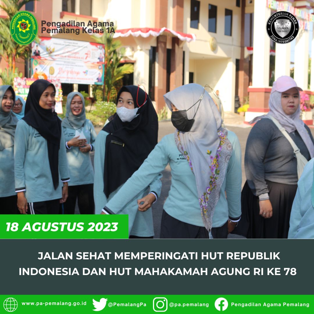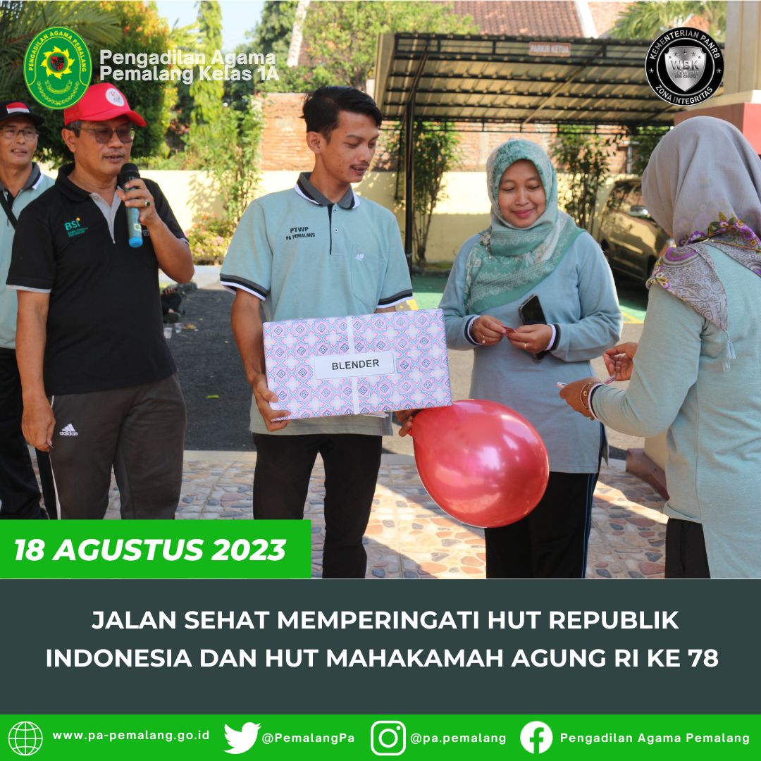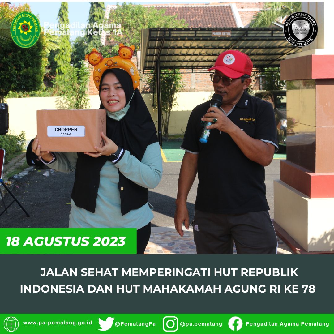 Pemalang, 18 Agustus 2023. Pukul 07.30 WIB Wakil Ketua Pengadilan Agama Pemalang Kelas 1A Drs. Husaini,S.H,.M.H. membuka acara jalan sehat yang diikuti oleh seluruh Keluarga Besar Pengadilan Agama Pemalang dan Siswa Prakerin. Kegiatan ini adalah sebagai bentuk syukur kepada Tuhan Yang Maha Esa dan kegembiraan dalam menyambut Hari Ulang Tahun Mahkamah Agung Repbulik Indonesia dan Hari Ulang Tahun Repbulik Indonesia Ke-78. Selain itu kegiatan ini juga bertujuan untuk mempererat tali silaturahmi Keluarga Besar Pengadilan Agama Pemalang. Selepas Jalan Sehat panitia memberikan hadiah doorprize kepada peserta jalan sehat yang beruntung.(EYK)