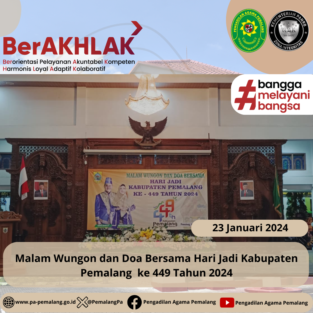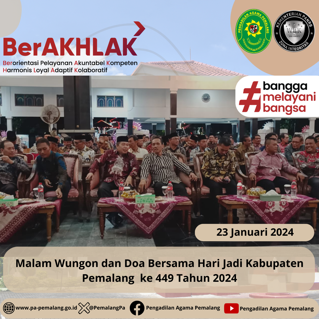 Ketua Pengadilan Agama Pemalang Solahuddin Sibagabariang, S.Ag.,M.H menghadiri undangan Kegiatan Malam Wungon dan Doa Bersama Hari Jadi Kabupaten Pemalang ke 449 Tahun 2024 di Pendopo Kabupaten Pemalang.