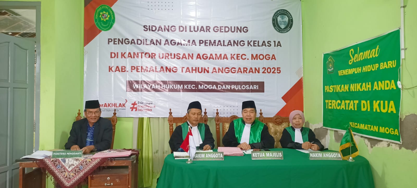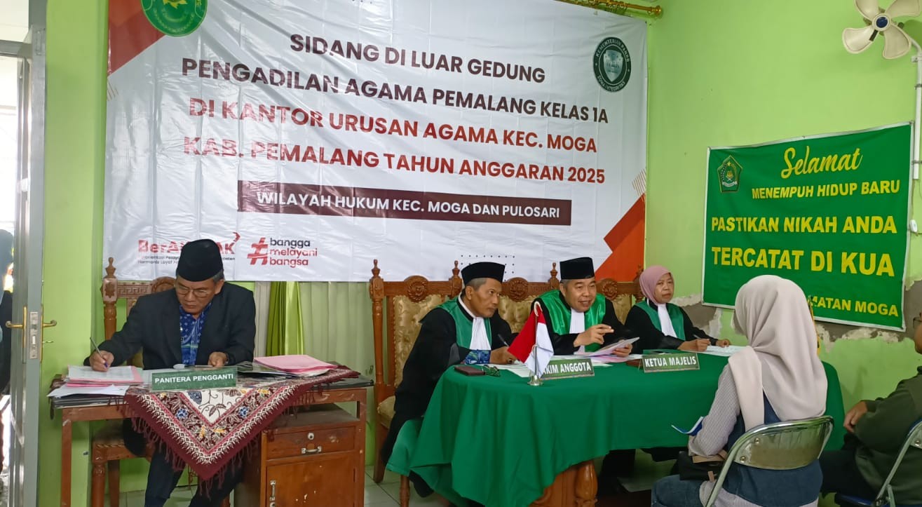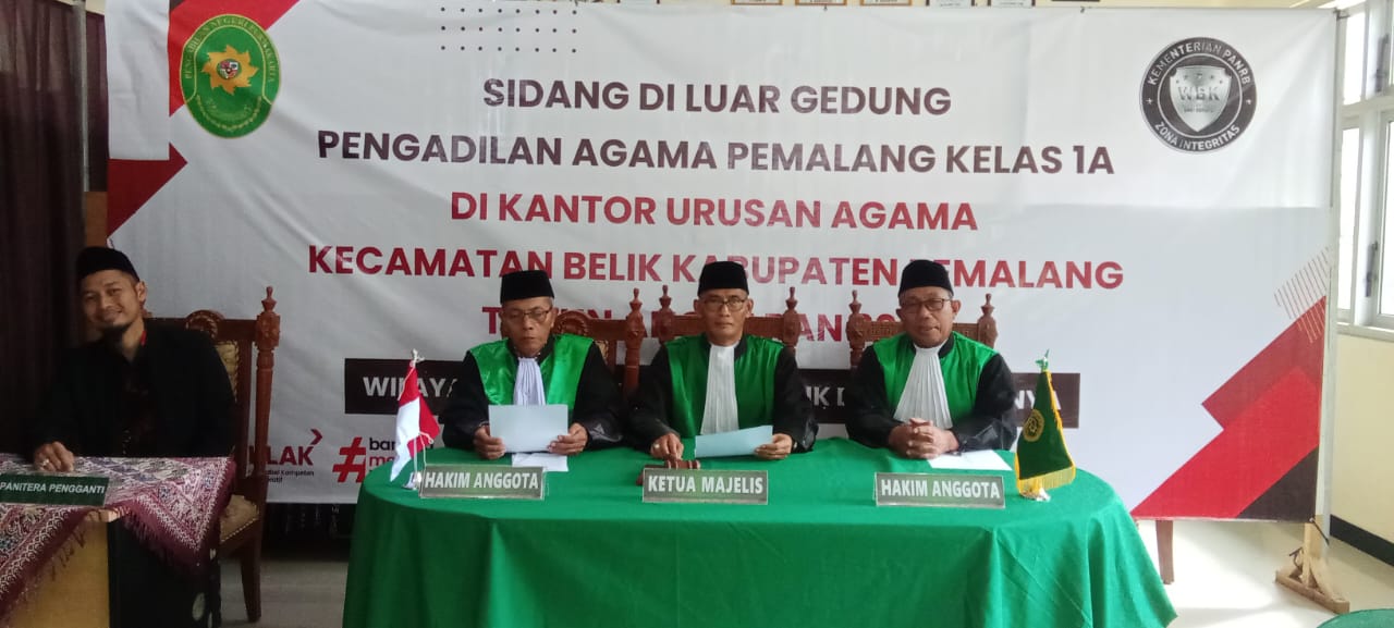 Pelaksanaan Sidang di Luar Gedung ( Sidang Keliling ) Pengadilan Agama Pemalang di KUA Kecamatan Belik Dan KUA Kecamatan Moga Kabupaten Pemalang. Sidang keliling Di KUA Belik Kecamatan Belik Kabupaten Pemalang hari ini terdiri dari Ketua Majelis Drs. H. Sobirin, M.H, didampingi 2 Hakim Anggota yaitu Drs. M. Sakdulloh dan Drs. Mohamad Taufik, S.H., M.S.I. dan Panitera Pengganti Adam Adzkiya Afifi, S.H.. Sementara di KUA Moga terdiri dari Ketua Majelis H. Solahuddin Sibagabariang, S.Ag.,M.H didampingi 2 hakim anggota yaitu Lukman Abdullah, S.H., M.H. dan Muwafiqoh,S.H.,M.H dan Panitera Muhammad Salafudin, S.Ag.,M.H. Dengan dilaksanakannya kegiatan sidang keliling ini mampu membantu masyarakat yang tempat tinggalnya jauh dari pengadilan dan ingin berperkara di Pengadilan Agama Pemalang, sehingga bisa mewujudkan pelayanan prima.
