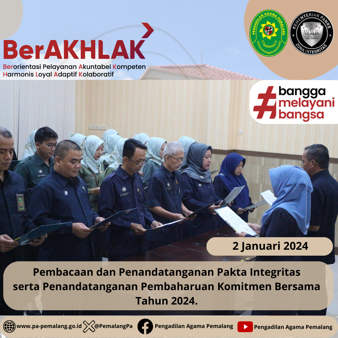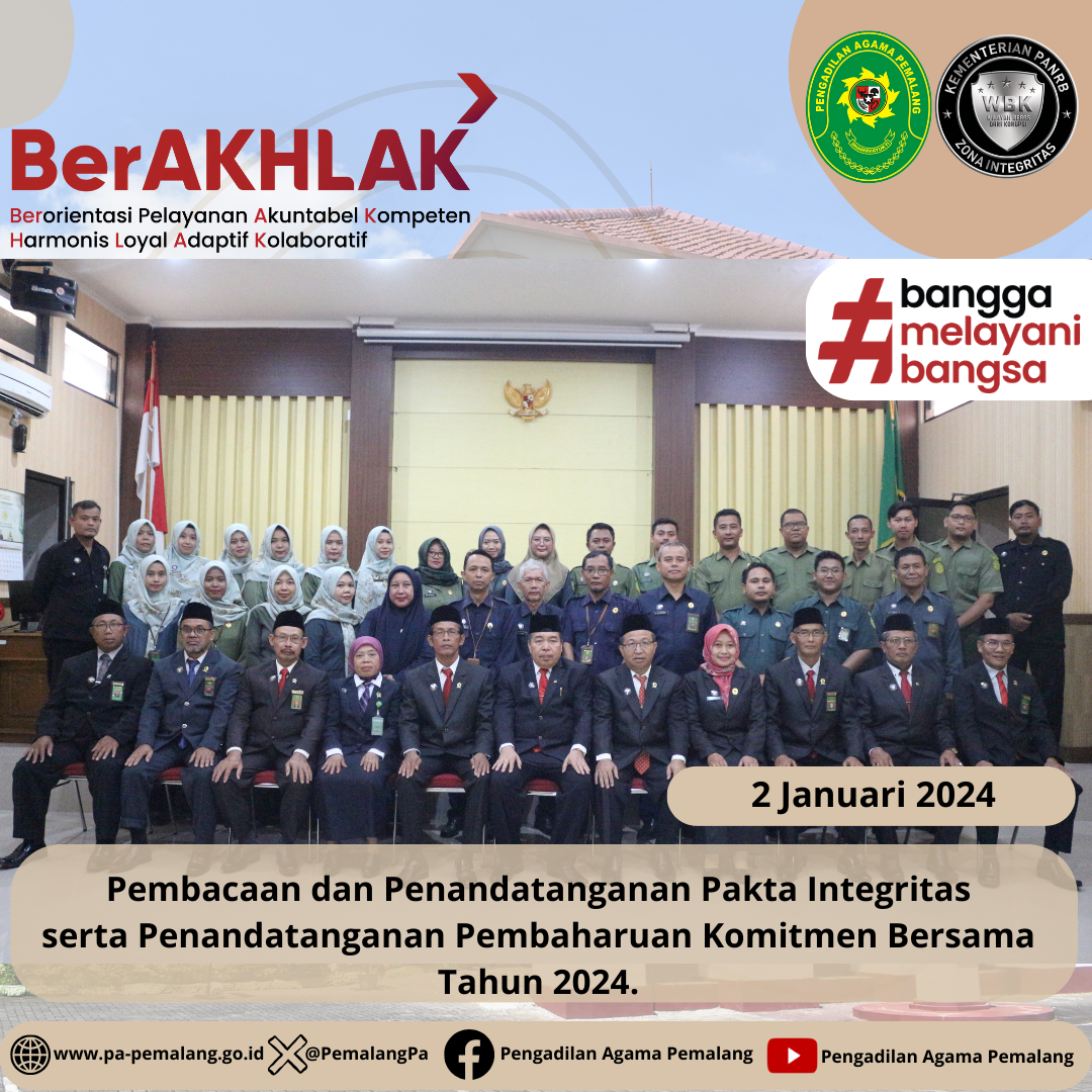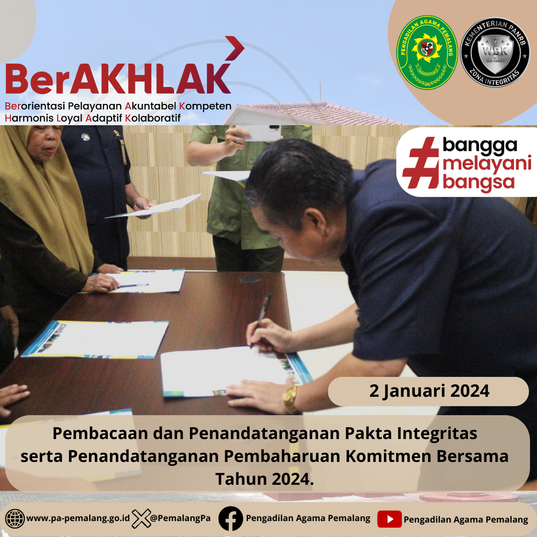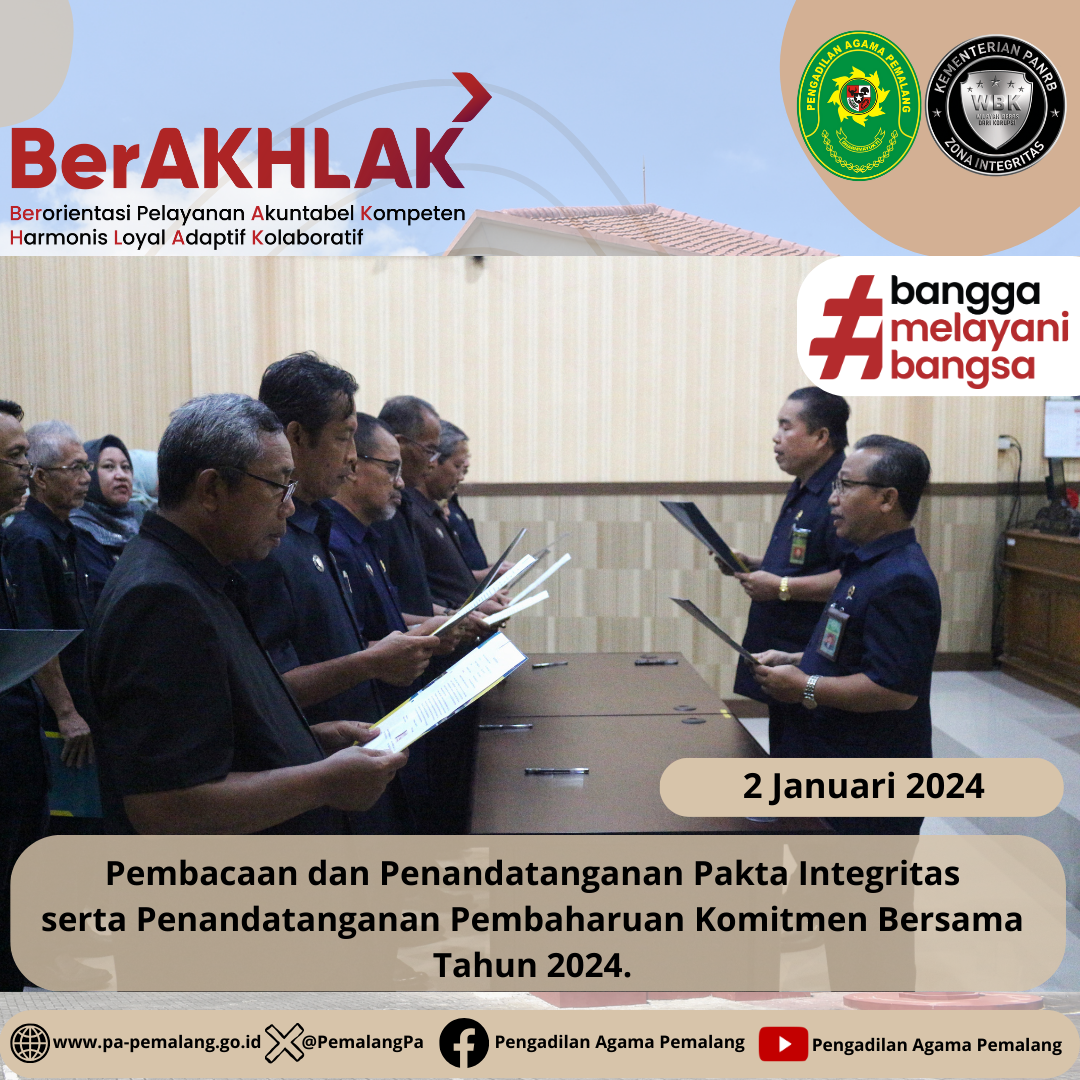 Bertempat di Ruang Sidang utama Abu bakar Ash Shidiq, Seluruh Pegawai Pengadilan Agama Pemalang Kelas IA melaksanakan kegiatan Pembacaan dan Penandatanganan Pakta Integritas serentak dengan disaksikan langsung oleh Ketua Pengadilan Agama Pemalang Solahuddin Sibagabariang S.Ag.,M.H. Dilanjutkan dengan Penandatanganan Pembaharuan Komitmen Bersama Tahun 2024 dalam rangka mewujudkan predikat Wilayah Birokrasi Bersih dan Melayani (WBBM).