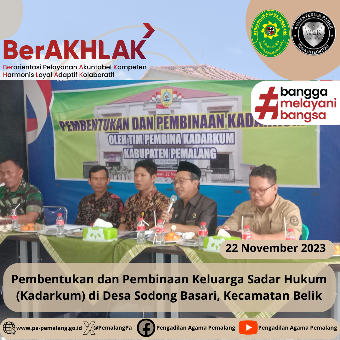 Mewakili Ketua Pengadilan Agama Pemalang, Wakil Ketua Pengadilan Agama Pemalang Drs. Husaini, S.H., M.H. menghadiri acara Keluarga Sadar Hukum (Kadarkum) di Desa Sodong Badari, Kec. Belik yang difasilitasi oleh pemerintah kabupaten Pemalang.(EYK)