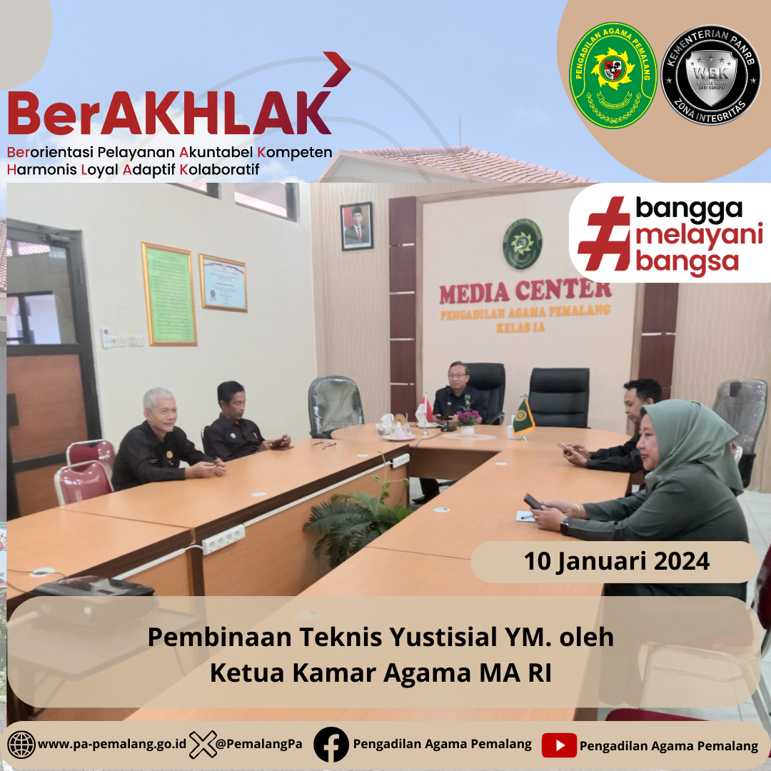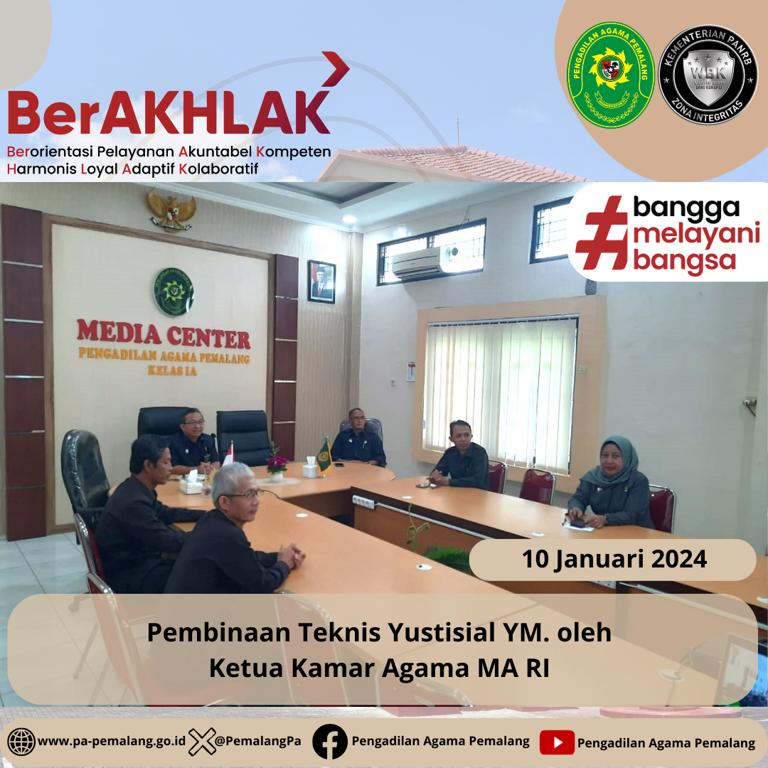 Bertempat di Media Center Pengadilan Agama, Wakil Ketua, Hakim dan Panitera Muda Pengadilan Agama Pemalang Mengikuti Pembinaan Teknis Yustisial YM. oleh Ketua Kamar Agama MA RI Prof. Dr. Drs. H. Amran Suadi, S.H.,M.Hum.,M.M