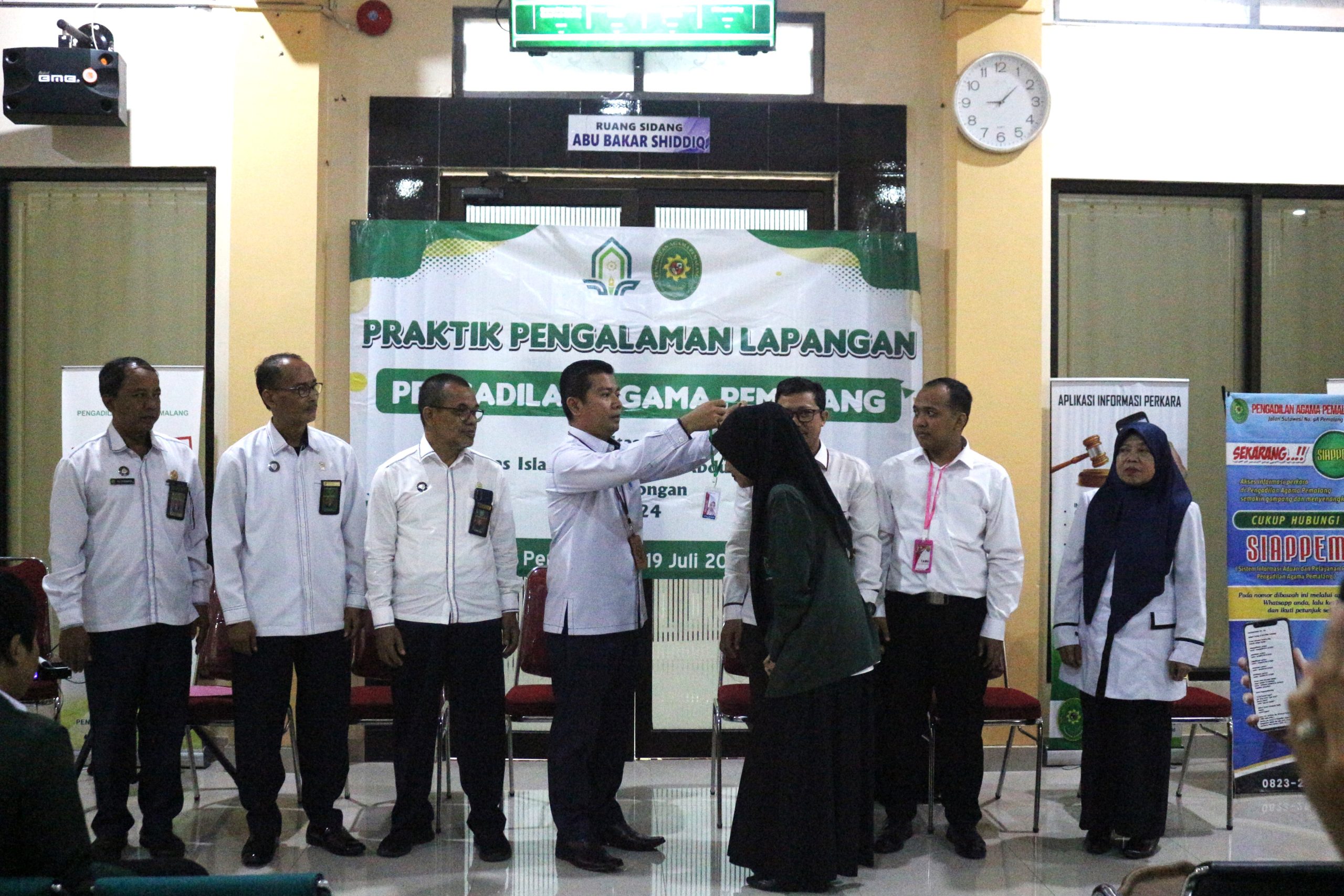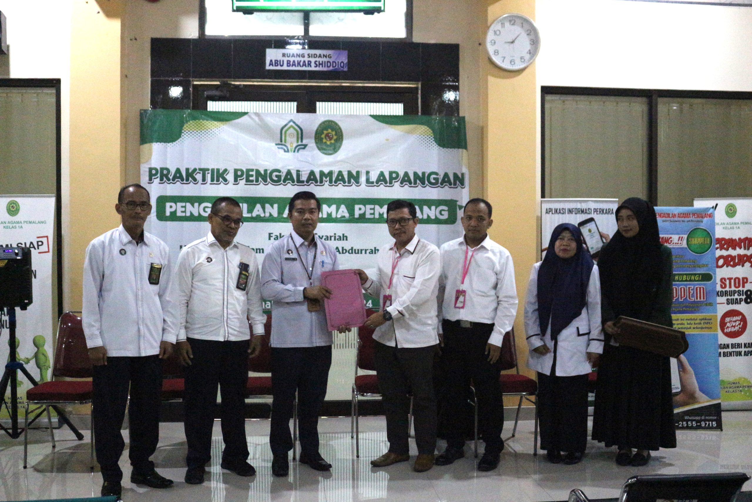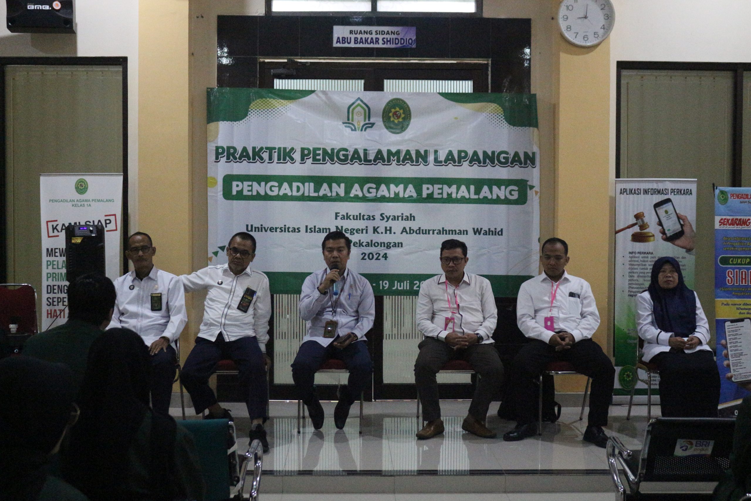 Pemalang, 1 Juli 2024. Bertempat di Ruang Tunggu Sidang, Wakil Ketua Pengadilan Agama Pemalang H. Fahmi R, S.Ag.,M.H.I dengan Hakim Pembimbing PPL Drs. H. Sobirin, M.H., Drs. Muhd. Jazuli dan Muwafiqoh,S.H.,M.H menerima mahasiswa dari UIN K.H Abdurrahman Wahid Pekalongan untuk melaksanakan Praktik Pengalaman Lapangan (PPL) di Pengadilan Agama Pemalang.