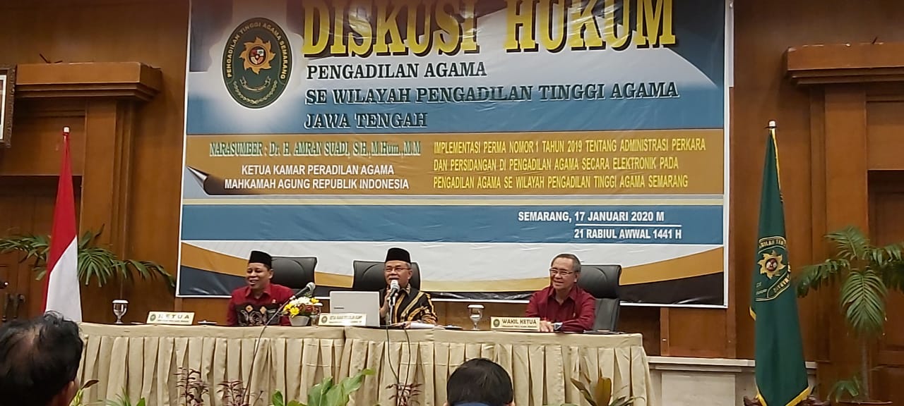 Narasumber dalam diskusi ini adalah Dr. H. Amran Suadi S.H, M.Hum, M.M Ketua Kamar Peradilan Agama Mahkamah Agung Republik Indonesia. Adapun diskusi tersebut bertema “Implementasi Peraturan Mahkamah Agung Nomor 1 tahun 2019 tentang administrasi perkara dan persidangan di Pengadilan Agama secara elektronik pada Pengadilan Agama se wilayah Pengadilan Tinggi Agama Semarang” Diskusi ini merupakan tindak lanjut dari surat Direktur Jenderal Badan Peradilan Agama Mahkamah Agung RI Nomor 1324/ Djt/OT.01.1/IV/2019 tanggal 12 April 2019 perihal Diskusi Teknis Yustisial.
