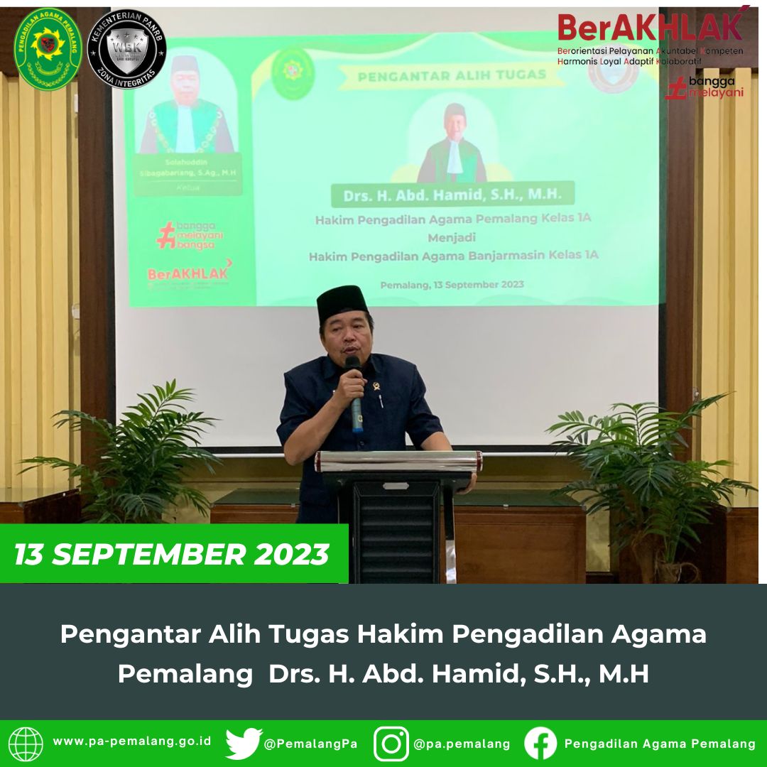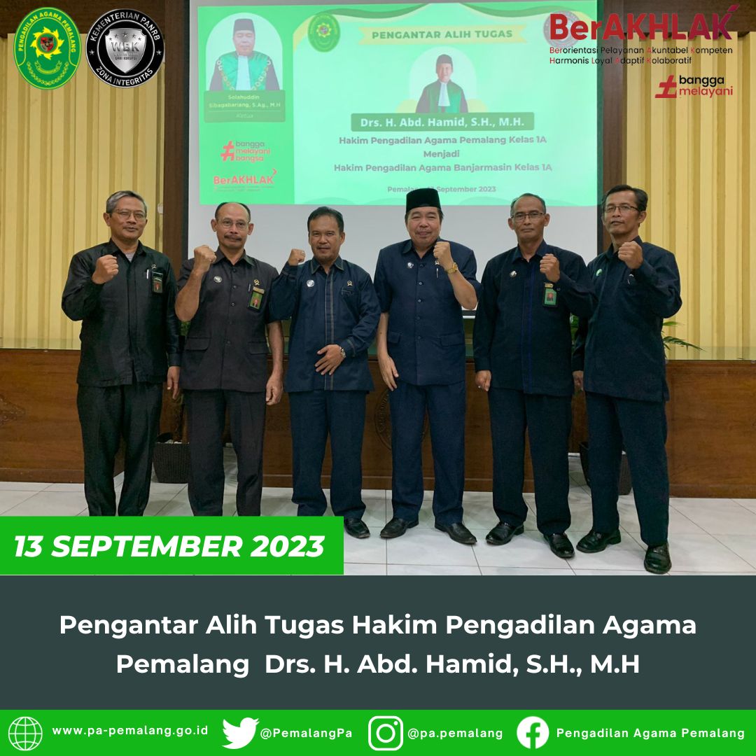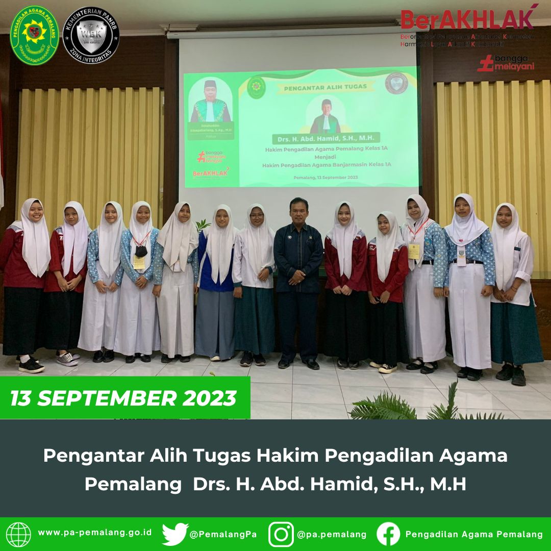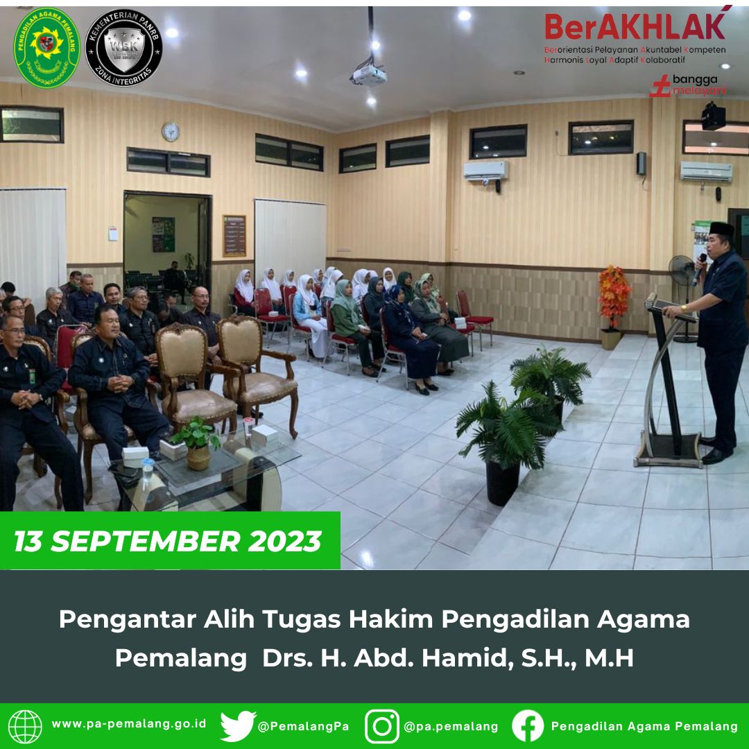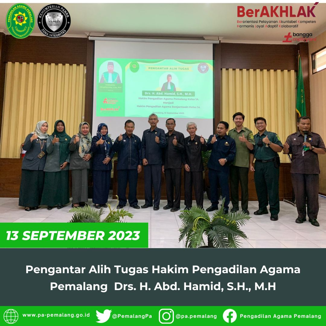 Bertempat Di Ruang Sidang Utama Abu Bakar Ash Shidiq pukul 13.30 di adakan acara Pengantar Alih Tugas Salah Satu Hakim Pengadilan Agama Pemalang Drs. H. Abd. Hamid, S.H., M.H yang akan berpindah tugas ke Pengadilan Agama Banjarmasin.