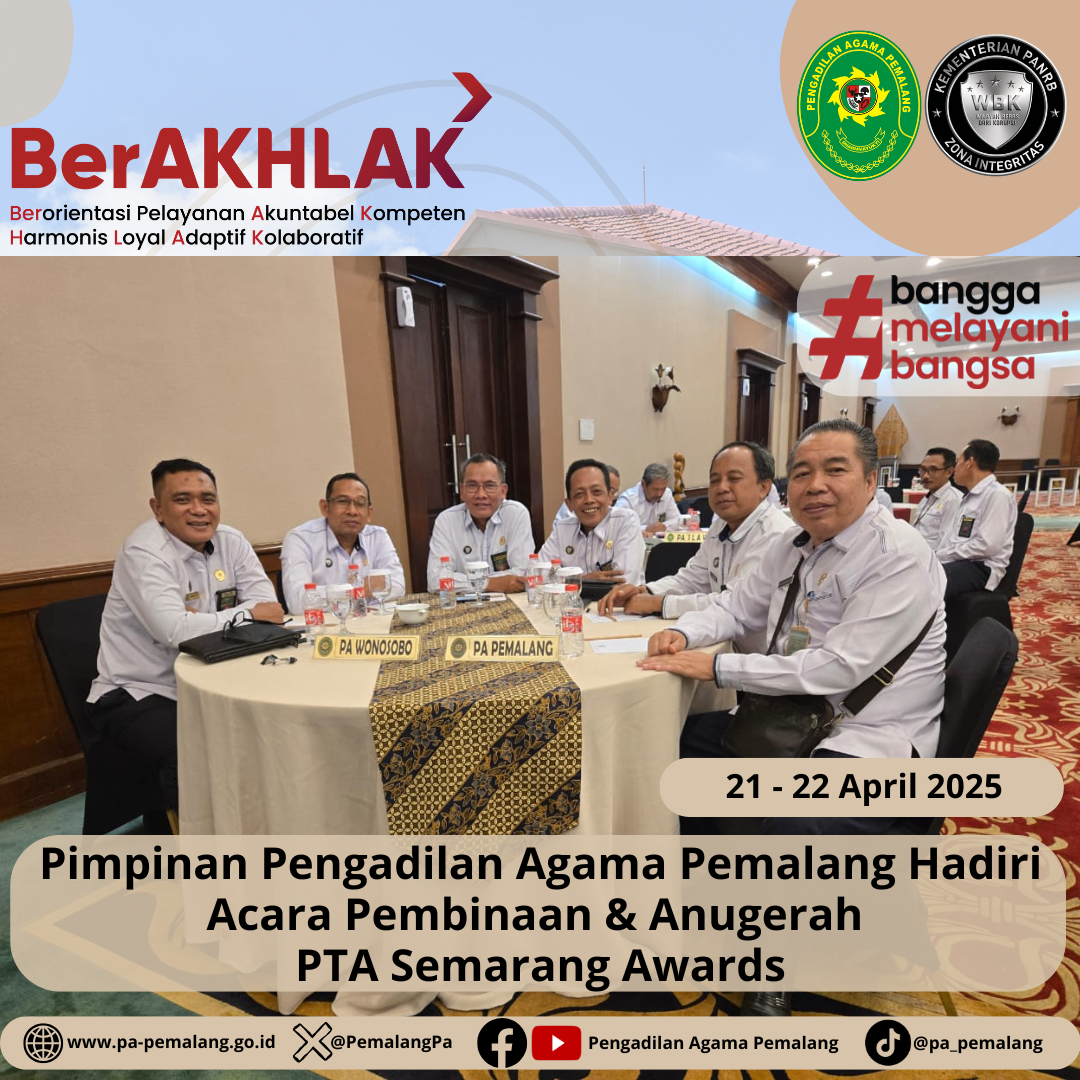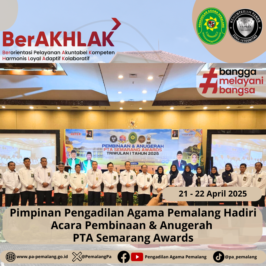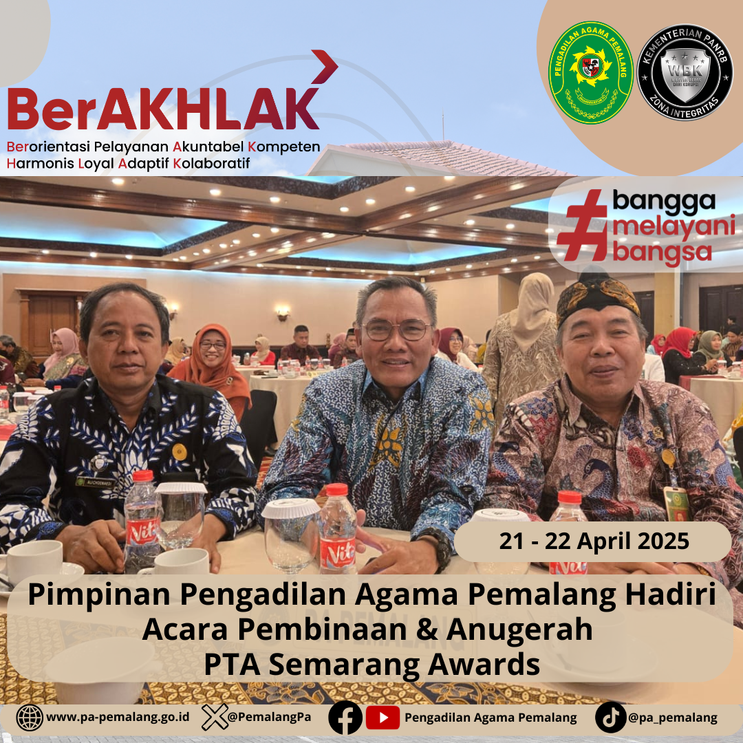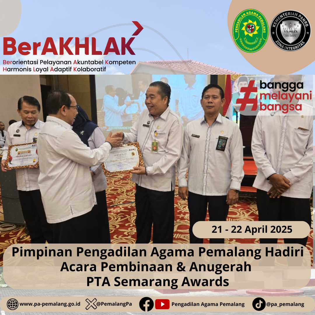 Senin-Selasa tanggal 21-22 April 2025, Pimpinan Pengadilan Agama Pemalang, Ketua H. Solahuddin Sibagabariang, S.Ag.,M.H, Panitera Muhammad Salafudin, S.Ag.,M.H dan Sekretaris Ali Choemaedi, S.H., menghadiri undangan Pembinaan dan Penganugerahan Pengadilan Tinggi Agama Semarang Awards Triwulan I Tahun 2025 yang diselenggarakan oleh Pengadilan Tinggi Agama (PTA) Semarang di The Sunan Hotel Solo, Kota Surakarta.