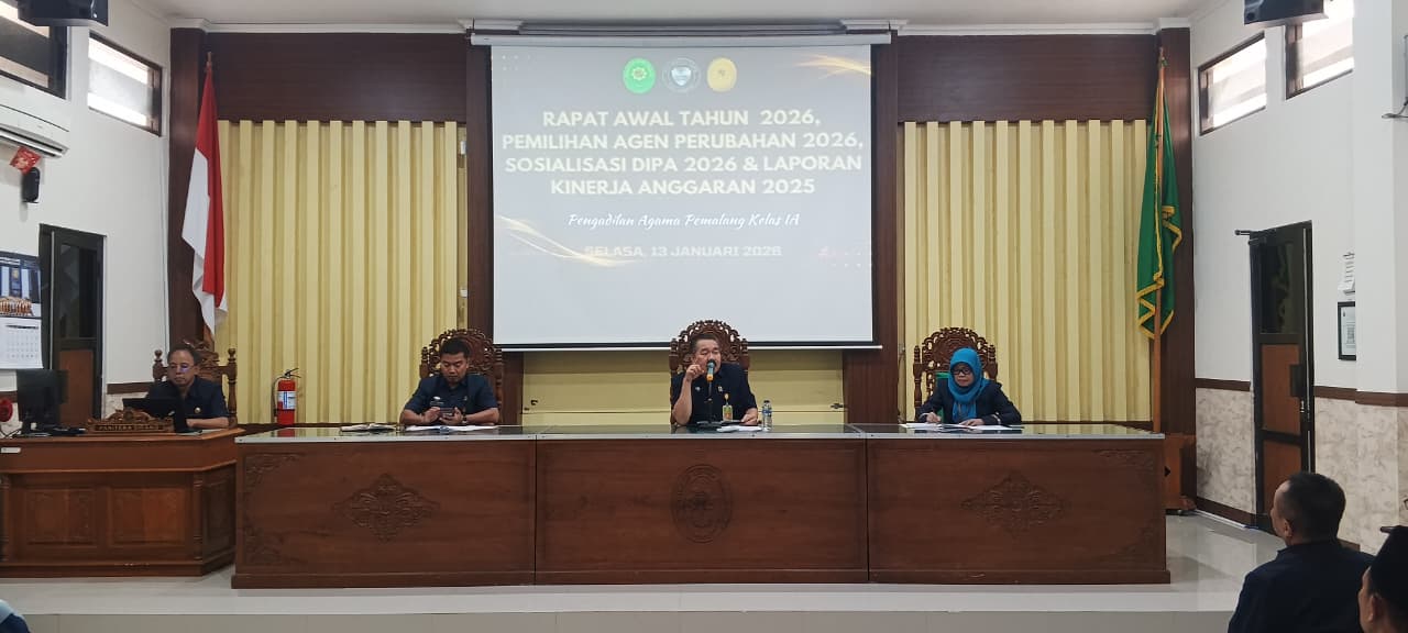 Bertempat di Ruang Sidang Abu Bakar Ash Shidiq pukul 14.00 WIB, diadakan rapat dinas bulan Januari 2026 Aparatur Pengadilan Agama Pemalang. Dalam kesempatan ini Ketua Pengadilan Agama Pemalang H. Solahuddin Sibagabariang, S.Ag, M.H., menyampaikan untuk tetap menjaga integritas dalam melaksanakan pekerjaan kita, tak lupa untuk selalu menerapkan 5 S (Senyum, Salam, Sapa, Sopan, dan Santun) dan 5 R (Ringkas, Rapi, Resik, Rawat, Rajin, Indah, dan Nyaman) dalam menjalankan tugas kita. Dalam kesempatan ini beliau juga menyampaikan target kinerja untuk tahun 2026 ini, dan berharap Pengadilan Agama Pemalang nisa meraih prestasi yang lebih baik lagi di tahun 2026 ini.