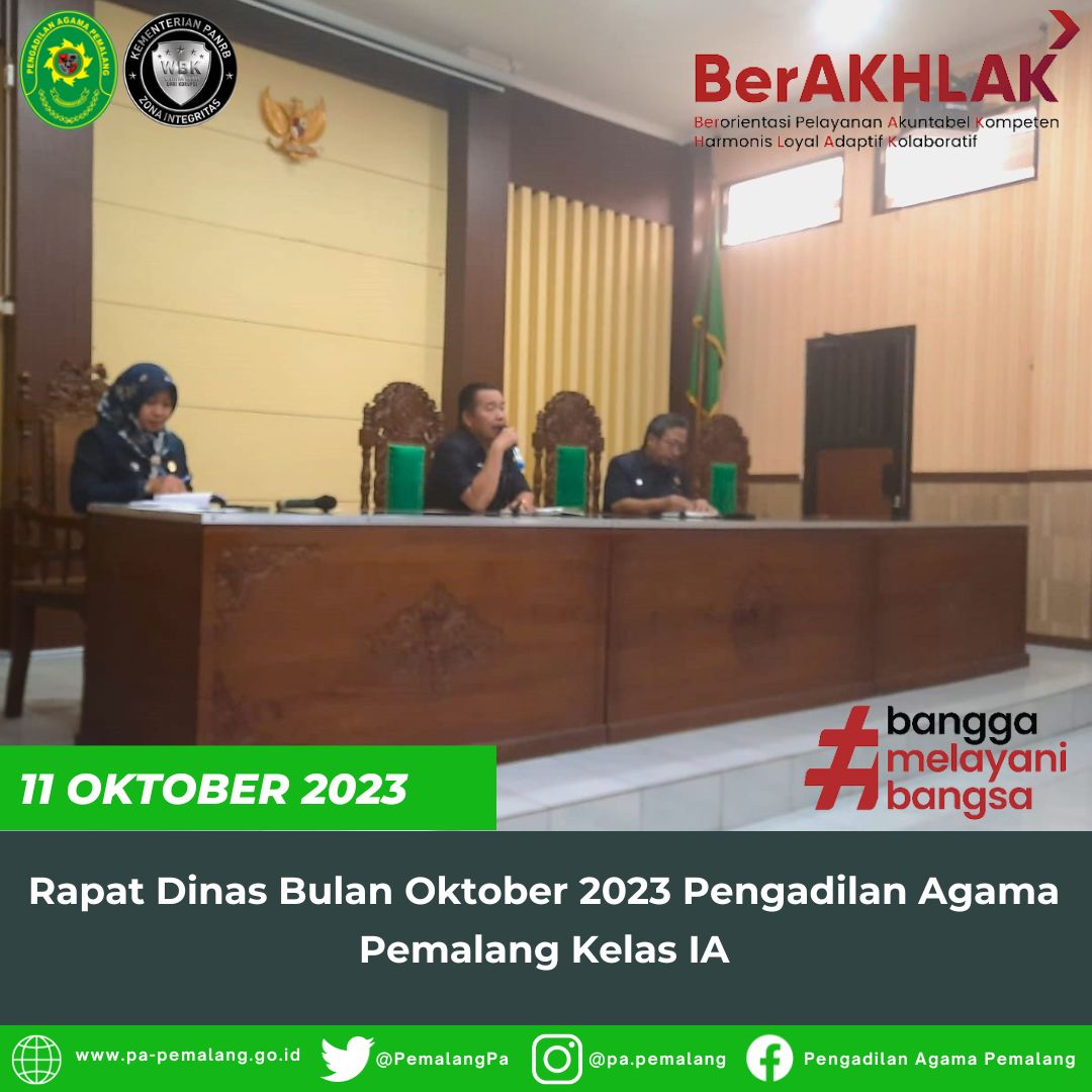 Seluruh Aparatur Pengadilan Agama Pemalang mengikuti Rapat Dinas Bulan Oktober yang dilaksanakan pukul 13.30 di Ruang Sidang Utama Abu Bakar Ash Shidiq. Membahas tentang Kinerja dalam 1 bulan terkahir dan membahas Pentingnya penerapan Disiplin. (EYK)