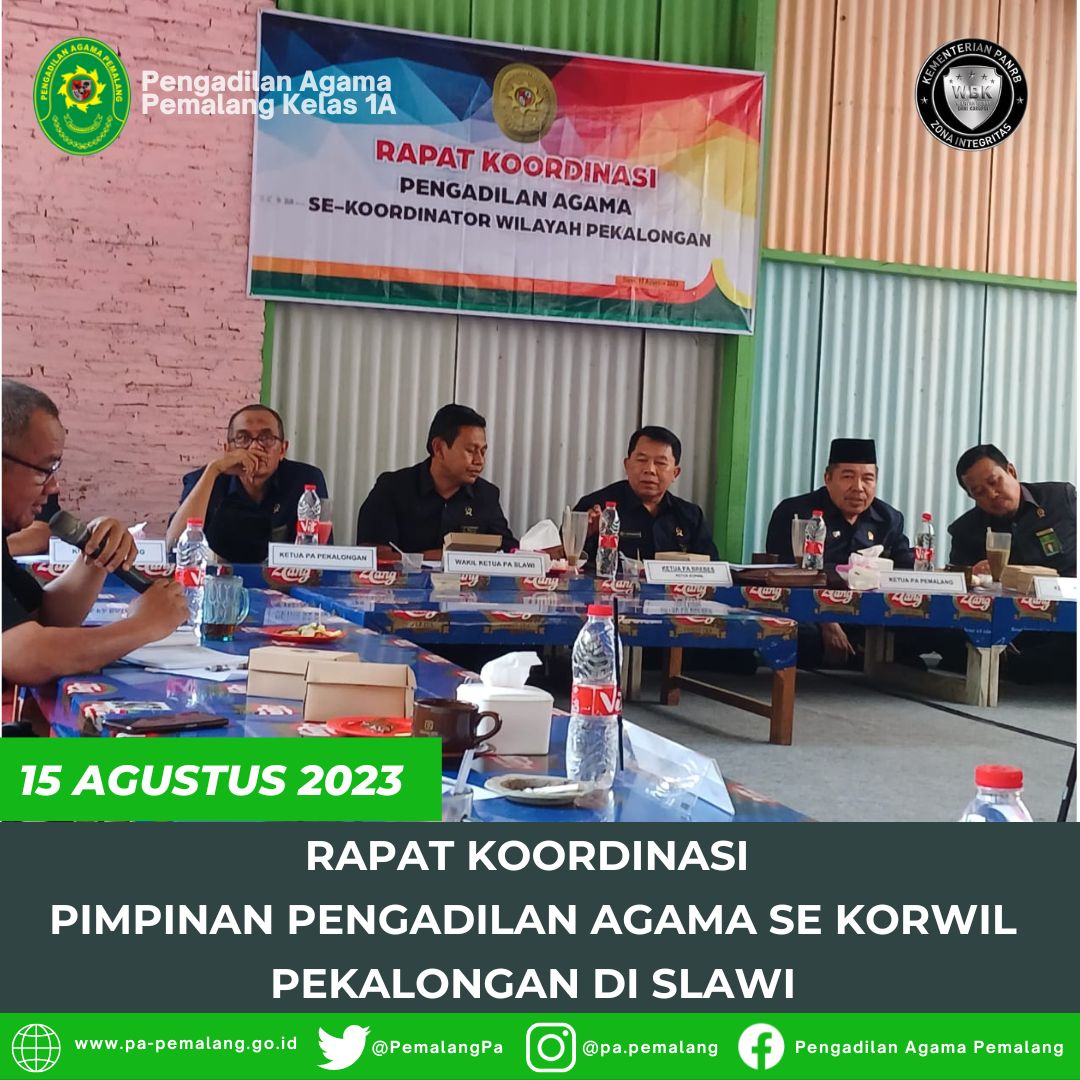 Slawi, 15 Agustus 2023. Rapat Koordinansi Pimpinan Pengadilan Agama Se Korwil Pekalogan Membahas tentang peningkatan Integritas Pimpinan dan seluruh Aparatur Sipil Negara (ASN) seluruh satker Pengadilan Agama, khususnya Pengadilan Agama Se Korwil Pekalongan.