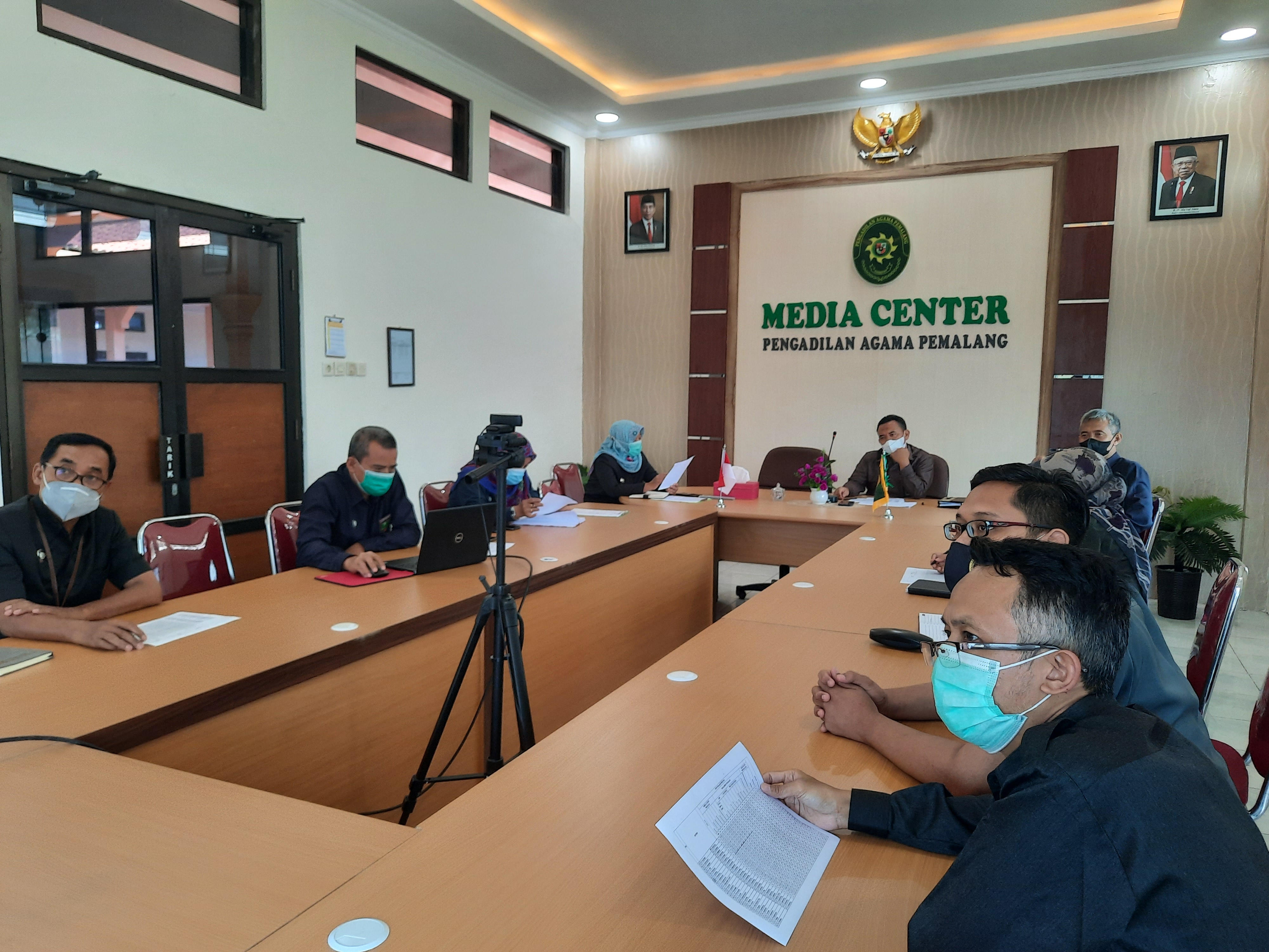 Pemalang, 28 Juli 2021. Sebagai tidak lanjut dari hasil penilaian prestasi triwulan I Pengadilan Agama Pemalang, hari ini dilakukan rapat pembahasan penilaian kerja yang dilaksanakan pada pukul 13.30 WIB di Ruang Media Center Pengadilan Agama Pemalang. Rapat ini dihadiri oleh Ketua Pengadilan Agama Pemalang Bapak Drs. H. Asrori, S.H., M.H. , Panitera Bapak Afif Eko Sulistiono, S.H., Sekretaris Ibu Mulyatun, S.H. Kepala Sub Bagian Perencanaan, Teknologi Informasi dan Pelaporan Bapak H. Ahmad Ali Syahbana, S.E., S.T., M.M , Kepala Sub Bagian Kepegawaian, Organisasi, dan Tata Laksana Bapak Slamet, S.Ag, M.H. Panitera Muda Hukum Ibu Fatiyah, S.H., Panitera Muda Gugatan Bapak M. Munjid Sudinoto, S. Ag., Analis Kepegawaian Pertama Marisatul Ula, S.Sos dan tim IT Yulita Intan Permatasari, A.Md dan Eko Yuda Kristanto, S.Kom.