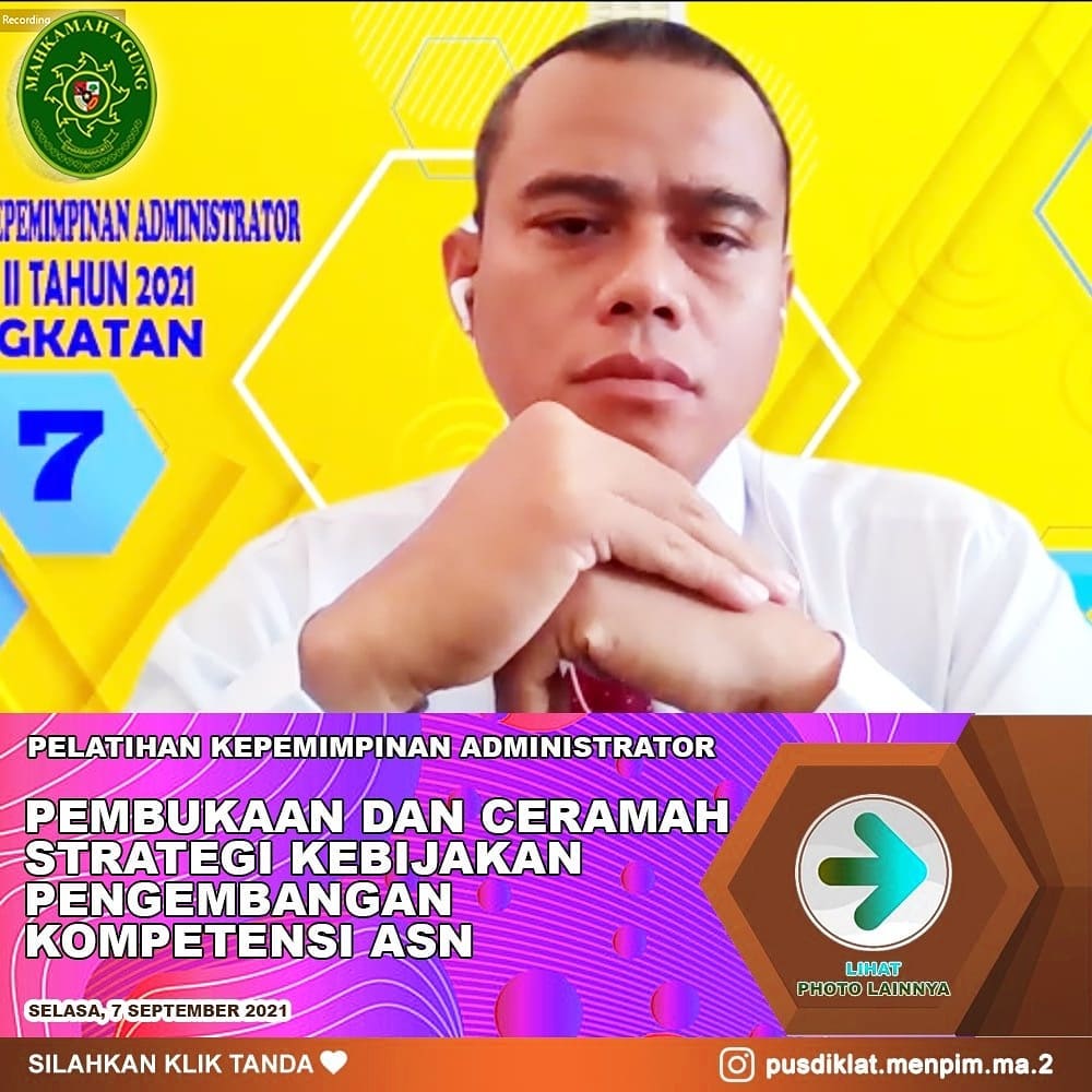 Pemalang, 06 September 2021. Mulai hari ini Kepala Sub Bagian Perencanaan Teknologi Informasi, Dan Pelaporan Pengadilan Agama Pemalang Bapak H Ahmad Ali Syahbana, S.E., S.T., M.M. mengikuti Pelatihan Online Kepemimpinan Administrator (PKA) Angkatan VI s.d VIII Dari Tempat Kerja Tahun Anggaran 2021. Pelatihan ini diselenggarakan mulai dari hari ini [06/09/2021] hingga 15 Desember 2021 dengan sistem On-Off. (yip)