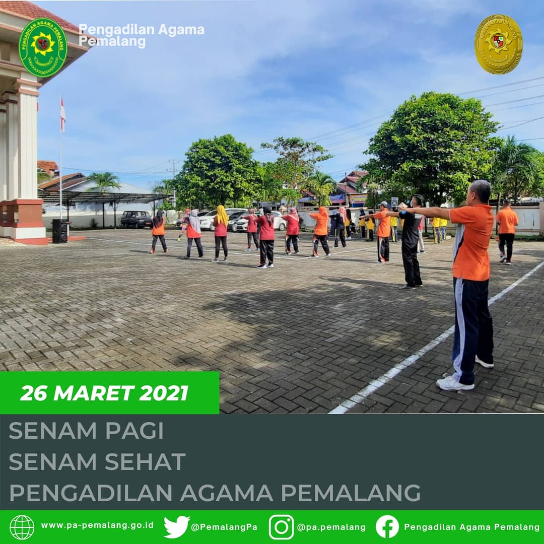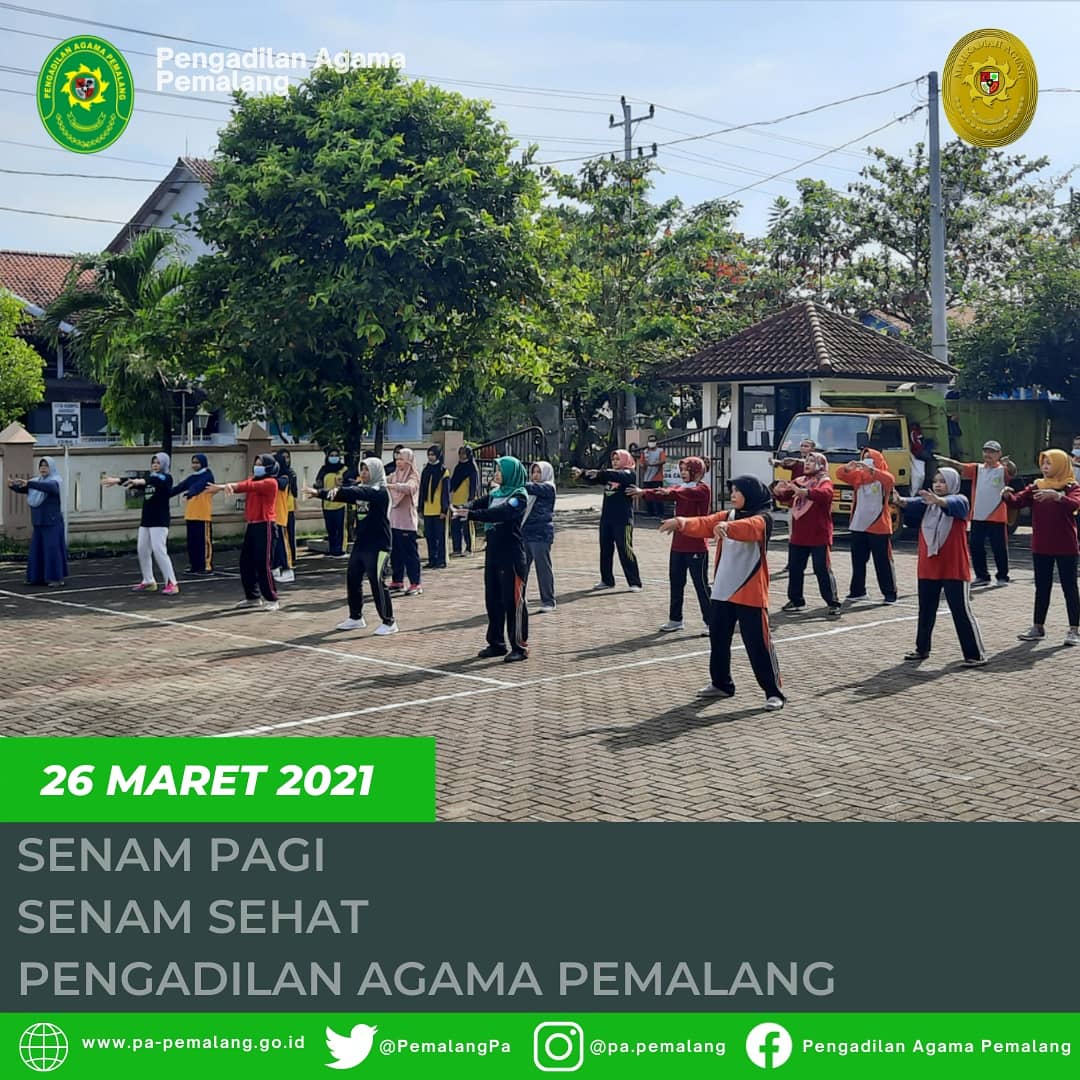 Pemalang, 26 Maret 2021. Senam pagi merupakan suatu aktifitas fisik yang perlu diadakan untuk menjaga kebugaran jasmani para pegawai. Gerakan-gerakan senam pagi bermanfaat untuk melatih otot-otot pada tubuh, melancarkan peredaran darah sehingga lebih sehat dan segar. Paparan sinar matahari pagi juga bagus bagi tubuh karena kandungan vitamin D alaminya. Jika tubuh sehat dan bugar secara fisik, maka kemampuan konsentrasi juga akan meningkat dan memudahkan dalam menyelesaikan pekerjaan sehari-hari. Senam juga dapat memperkuat tulang, membantu menormalkan aliran darah dan melatih urat saraf yang kaku serta meningkatkan kesehatan jantung dan stamina tubuh. Olahraga ini juga bisa menjaga fungsi otak, mencegah pikun, juga bisa mengurangi stress dan membuat lebih bahagia karena dengan kita melakukan gerakan senam maka tubuh akan melepaskan hormon endorphine.