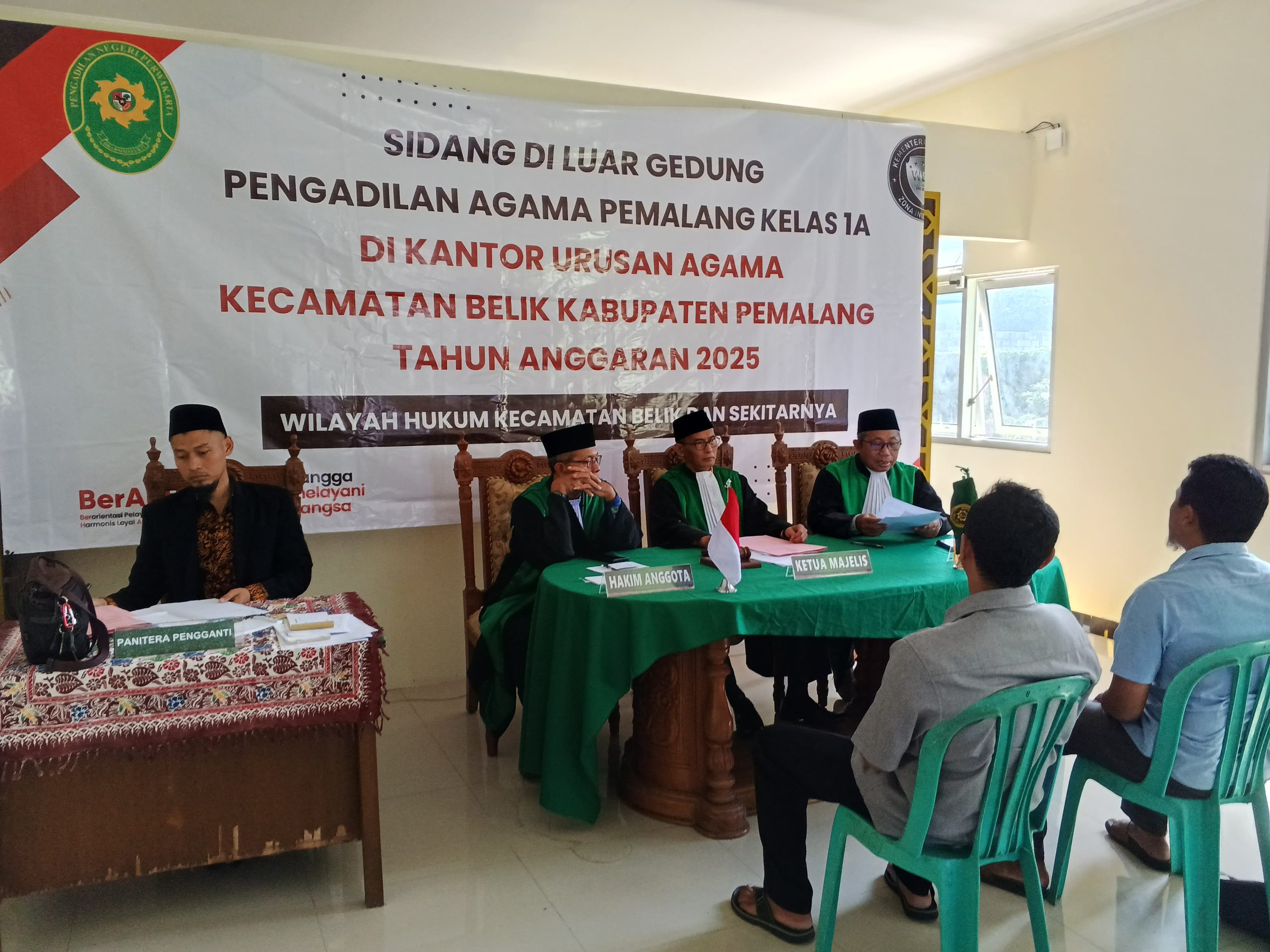 Pelaksanaan Sidang di Luar Gedung ( Sidang Keliling ) Pengadilan Agama Pemalang di KUA Kecamatan Belik Dan KUA Kecamatan Moga Kabupaten Pemalang. Sidang keliling Di KUA Belik Kecamatan Belik Kabupaten Pemalang hari ini terdiri dari Ketua Majelis Drs. H. Sobirin, M.H, didampingi 2 Hakim Anggota yaitu Drs. M. Sakdulloh dan Drs. Mohamad Taufik, S.H., M.S.I. dan Panitera Pengganti Adam Adzkiya Afifi, S.H.. Sementara di KUA Moga terdiri dari Ketua Majelis H. Solahuddin Sibagabariang, S.Ag.,M.H didampingi 2 hakim anggota yaitu Lukman Abdullah, S.H., M.H. dan Muwafiqoh,S.H.,M.H dan Panitera Muhammad Salafudin, S.Ag.,M.H. Dengan dilaksanakannya kegiatan sidang keliling ini mampu membantu masyarakat yang tempat tinggalnya jauh dari pengadilan dan ingin berperkara di Pengadilan Agama Pemalang, sehingga bisa mewujudkan pelayanan prima.
