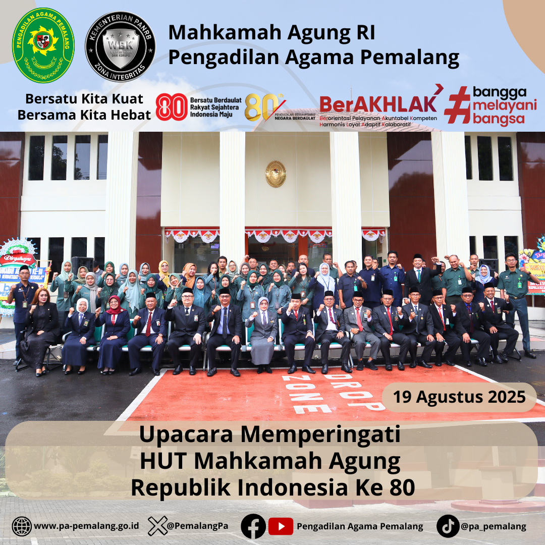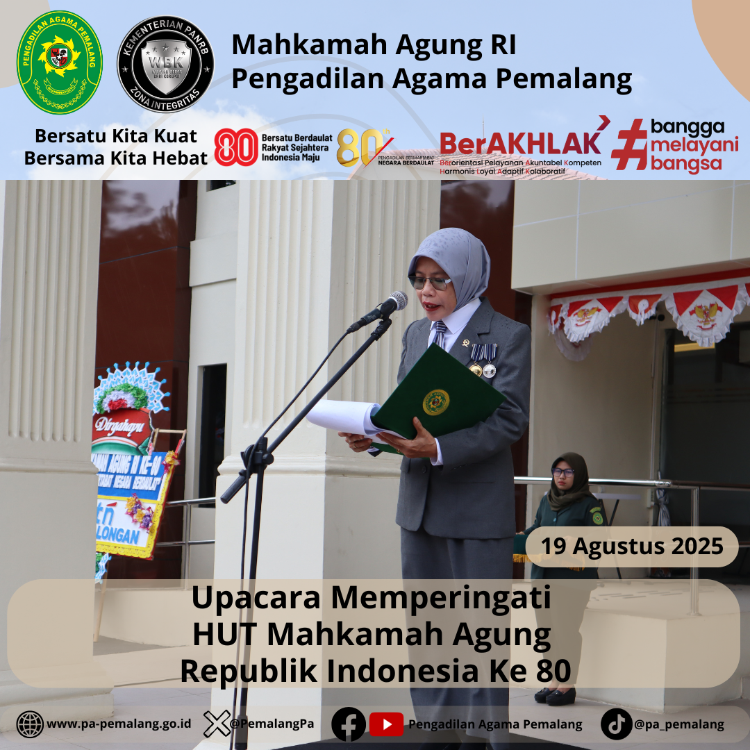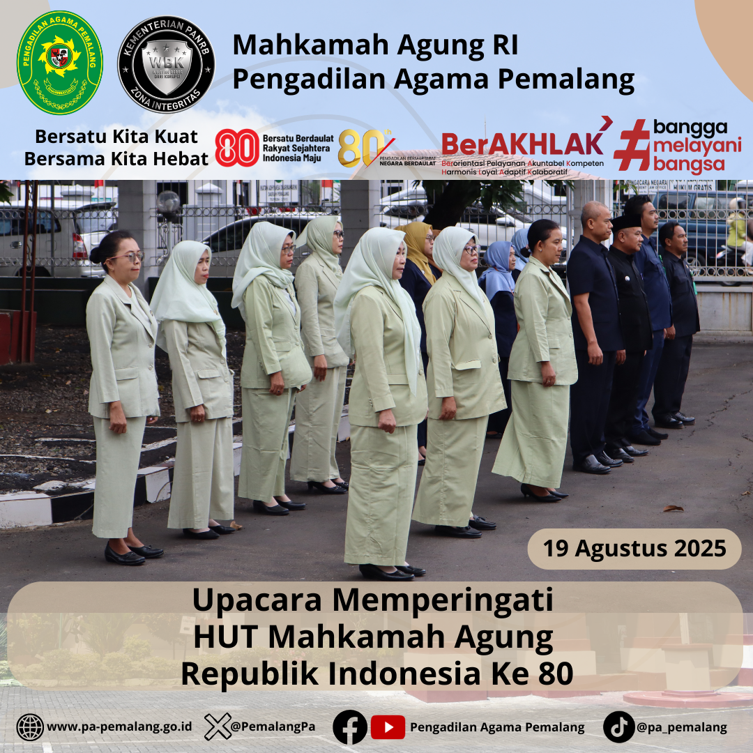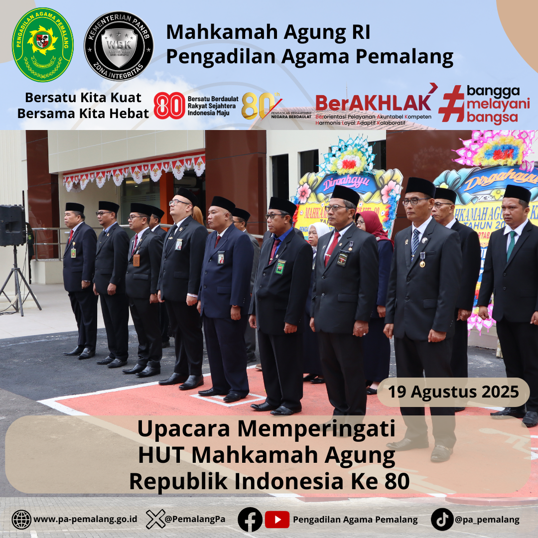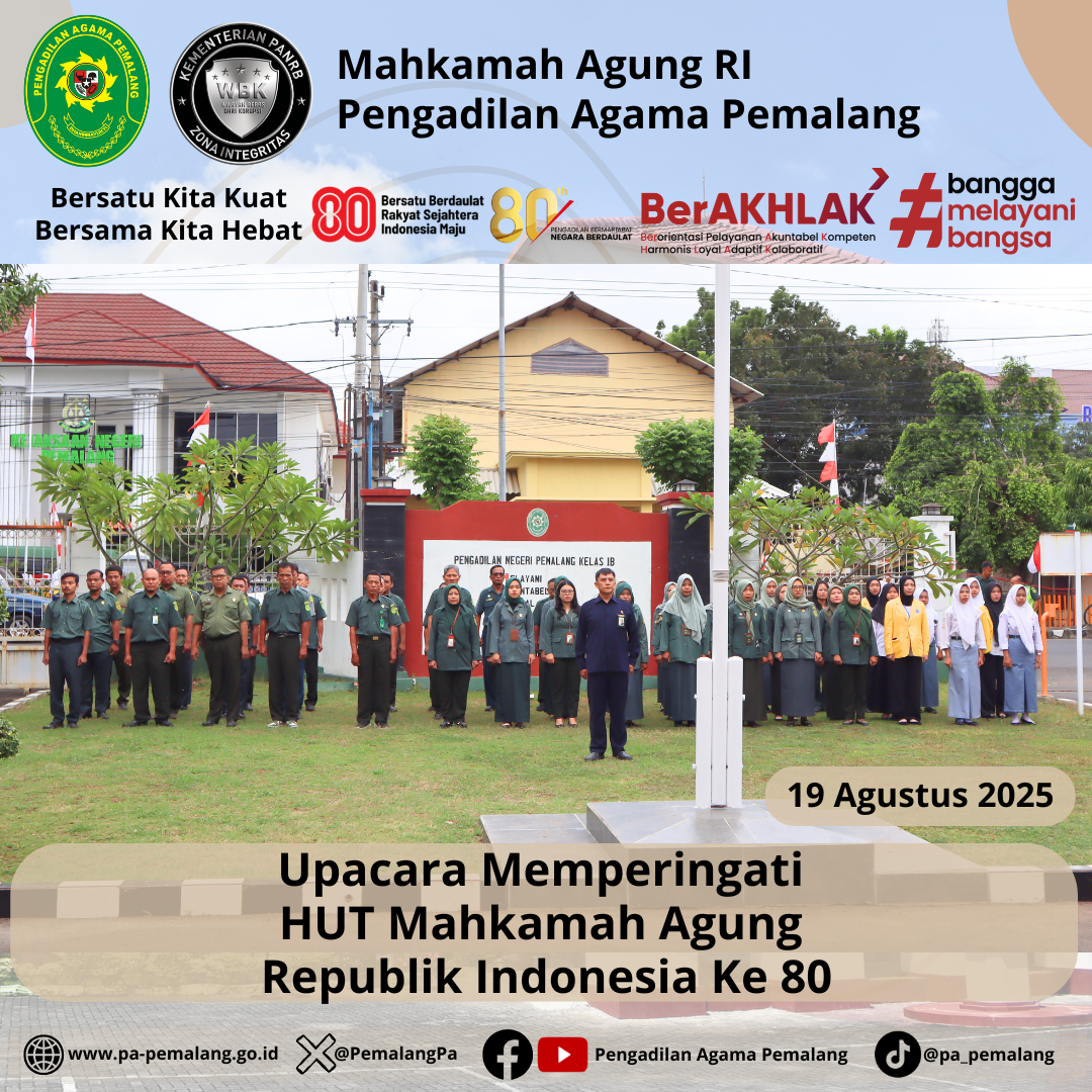 Pada Selasa, 19 Agustus 2025, Pengadilan Negeri Pemalang bersama Pengadilan Agama Pemalang melaksanakan Upacara HUT Mahkamah Agung RI ke-80 dengan tema “Pengadilan Bermartabat, Negara Berdaulat” di Halaman Kantor Pengadilan Negeri Pemalang dan dipimpin oleh Ketua Pengadilan Negeri Pemalang.