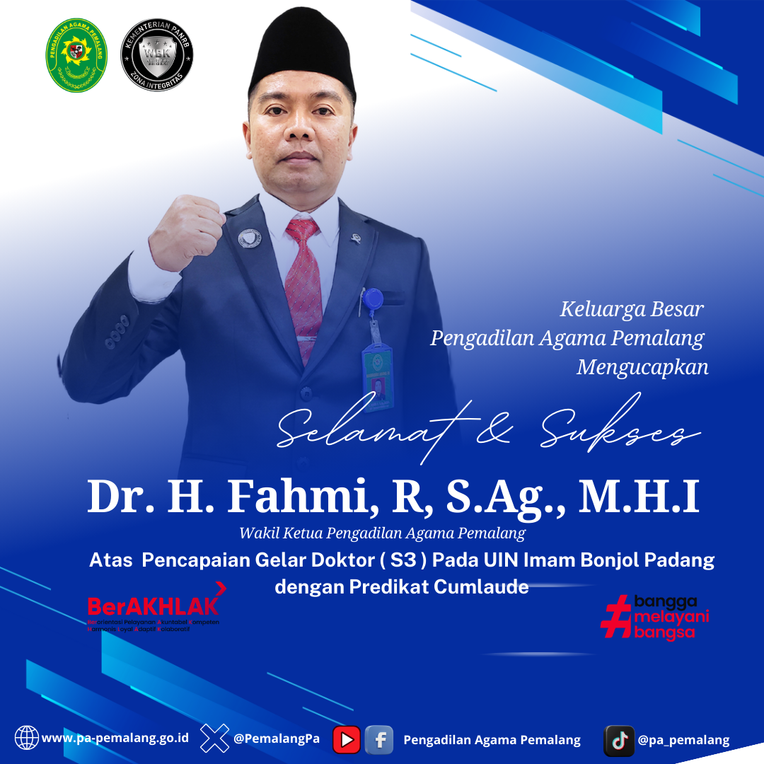 Keluarga Besar Pengadilan Agama Pemalang Mengucapkan Selamat & Sukses Dr. H. Fahmi, R, S.Ag., M.H.I Wakil Ketua Pengadilan Agama Pemalang Atas Pencapaian Gelar Doktor ( S3 ) Pada UIN Imam Bonjol Padang dengan Predikat Cumlaude.