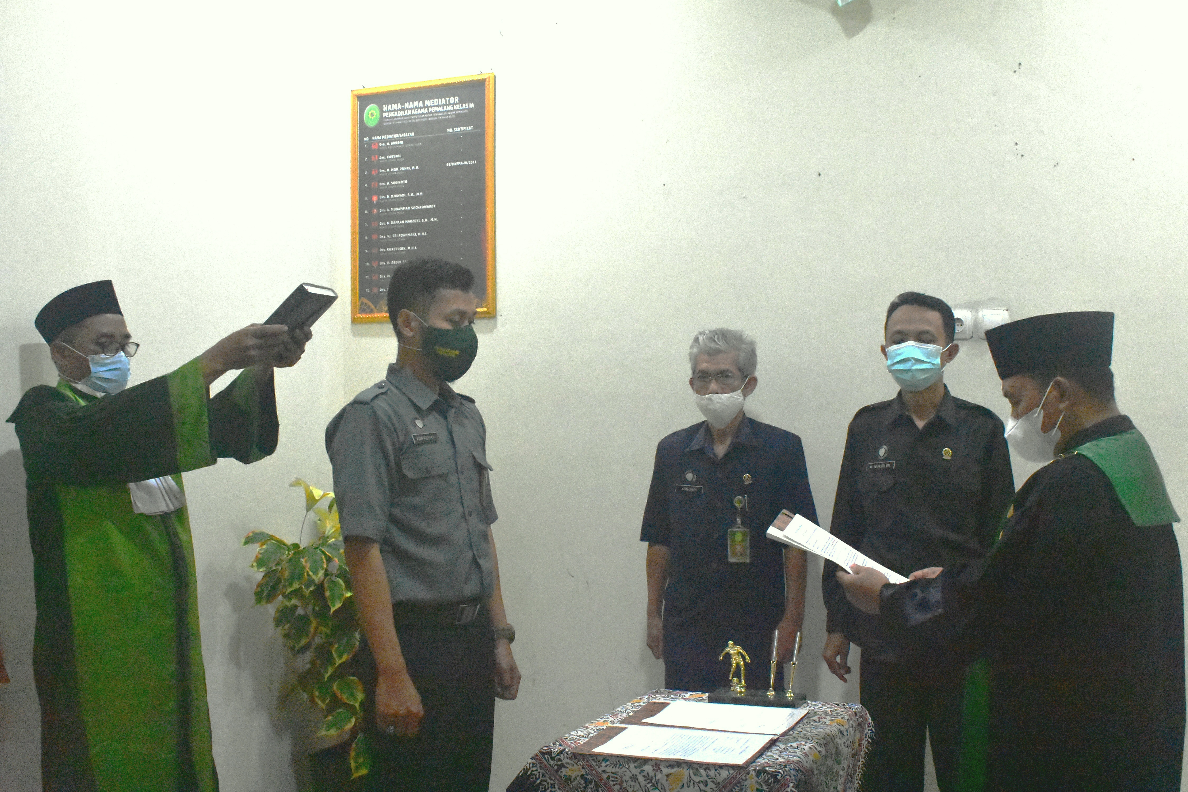 Bertindak sebagai Saksi 1 Bapak M. Munjid Sudinoto, S. Ag. yang merupakan Panitera Muda Gugatan Pengadilan Agama Pemalang serta bertindak sebagai Saksi 2 Bapak Asngadi, S.H. yang merupakan Panitera Pengganti Pengadilan Agama Pemalang. Adapun bertindak selaku Rohaniawan Bapak Slamet, S.Ag., M.H. yang juga merupakan Kasubag Kepegawaian, Organisasi, Dan Tata Laksana Pengadilan Agama Pemalang. Pembacaan Surat Keputusan Ketua Pengadilan Agama Pemalang oleh Kasubag Umum dan Keuangan Bapak Agung Wibowo S.Kom tentang Penunjukan Jurusita Pengganti Pada Pengadilan Agama Pemalang. (yip)