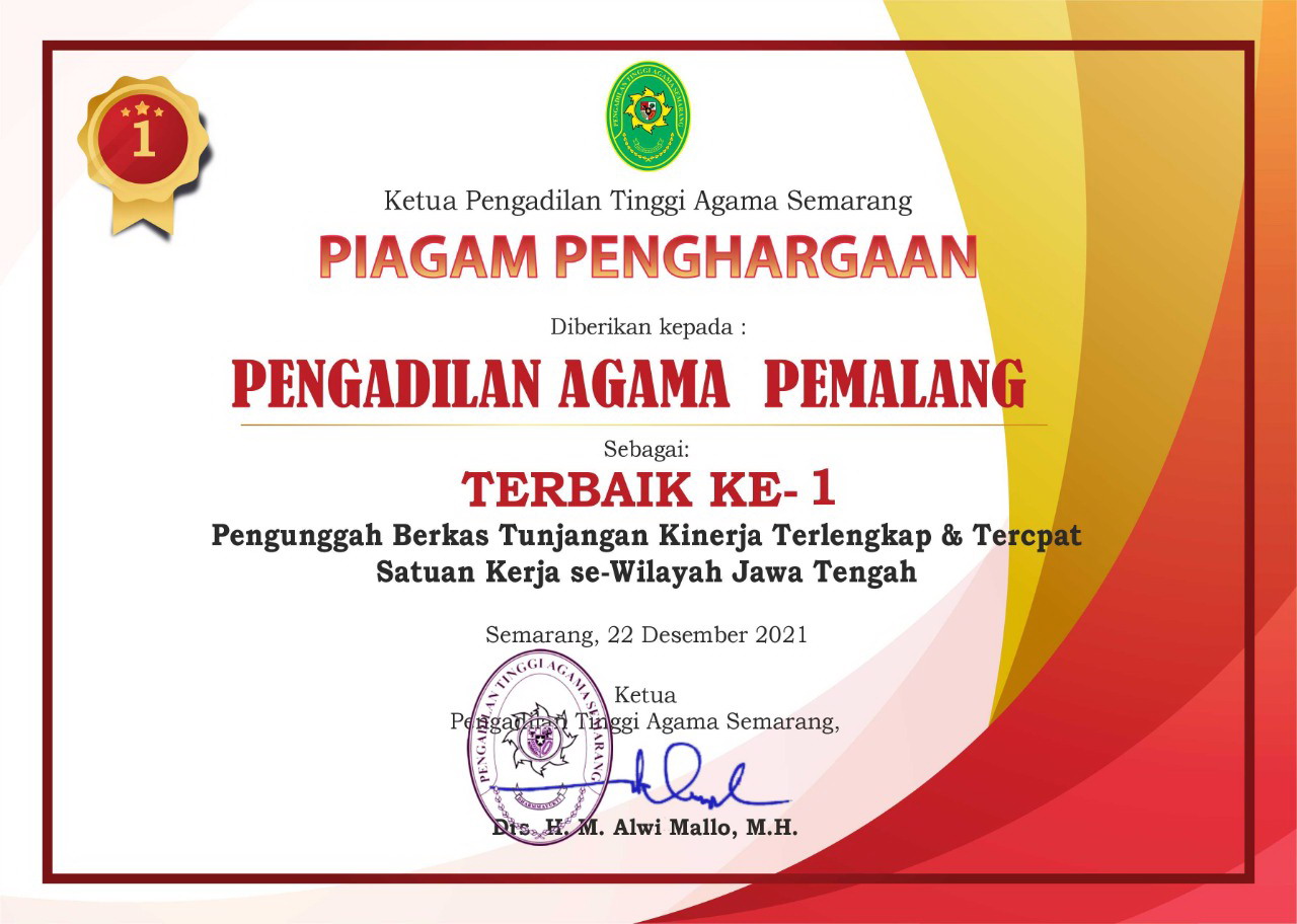 Tahun 2021 merupakan tahun emas bagi Pengadilan Agama Pemalang Kelas 1A. Banyak prestasi-prestasi yang di raih selama tahun 2021. Dibawah pimpinan Ketua Drs. H. Asrori, S.H., M.H. Pengadilan Agama Pemalang bahkan mampu meraih peringkat 3 Nasional Kinerja SIPP PA Kategori I. Berikut ini merupakan capaian-capaian keberhasilan yang diraih PA Pemalang selama tahun 2021 :