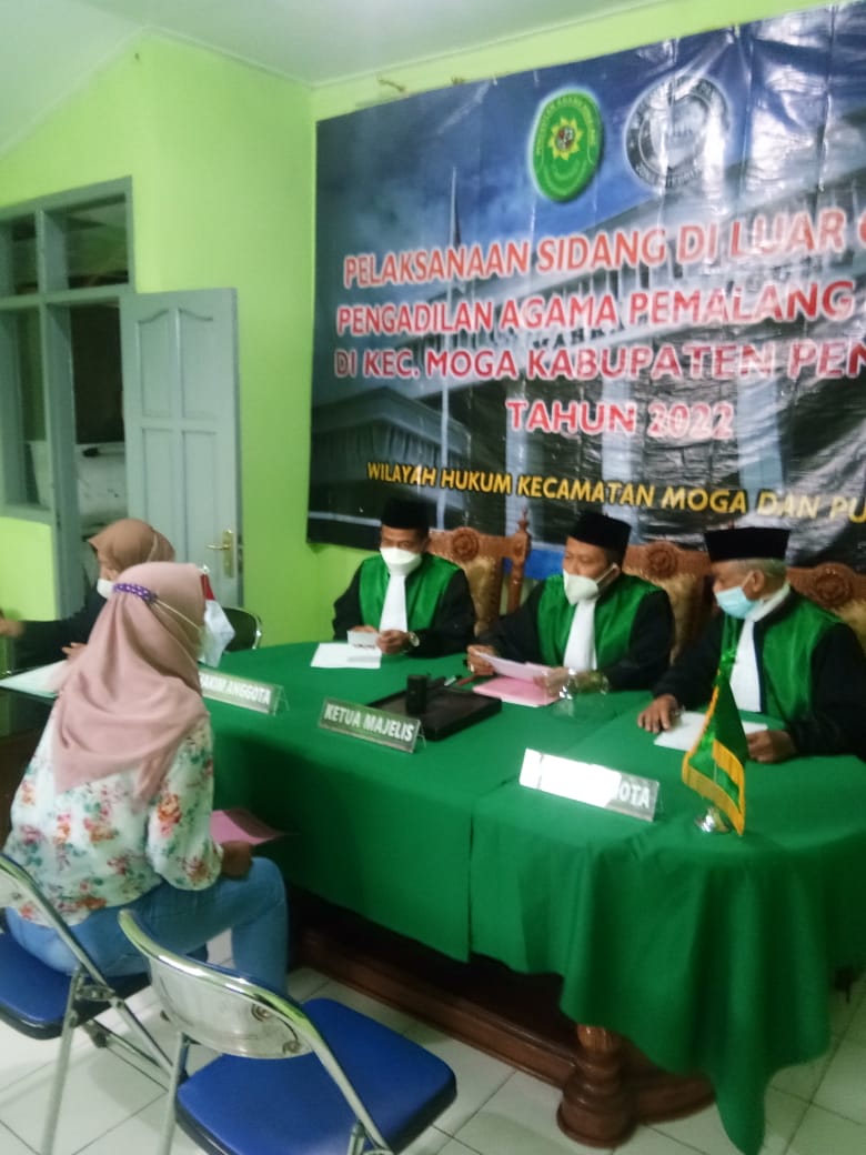 Jum’at, 18 Februari 2022 - Pengadilan Agama Pemalang melaksanakan sidang keliling kembali, sidang keliling kali ini diselenggarakan di 2 lokasi berbeda, yang pertama di Kantor KUA Kecamatan Belik dan Kantor KUA Kecamatan Moga. Sidang keliling adalah sidang pengadilan yang dilaksanakan di luar gedung pengadilan yang di peruntukan bagi masyarakat yang mengalami hambatan untuk datang ke kantor pengadilan karena alasan jarak, transportasi dan biaya. Adapun manfaat sidang keliling bagi masyarakat antara lain untuk memudahkan masyarakat karena sidang lebih dekat dengan tempat tinggal yang mengajukan perkara, biaya transportasi lebih ringan, dan menghemat waktu. Kegiatan tersebut dihadiri oleh pihak dari KUA Kecamatan Belik dan KUA Kecamatan Moga beserta jajarannya yang telah memfasilitasi agar kegiatan tersebut bisa berjalan sesuai dengan perencanaan dan juga para pihak pencari keadilan yang berasal dari daerah di sekitar.