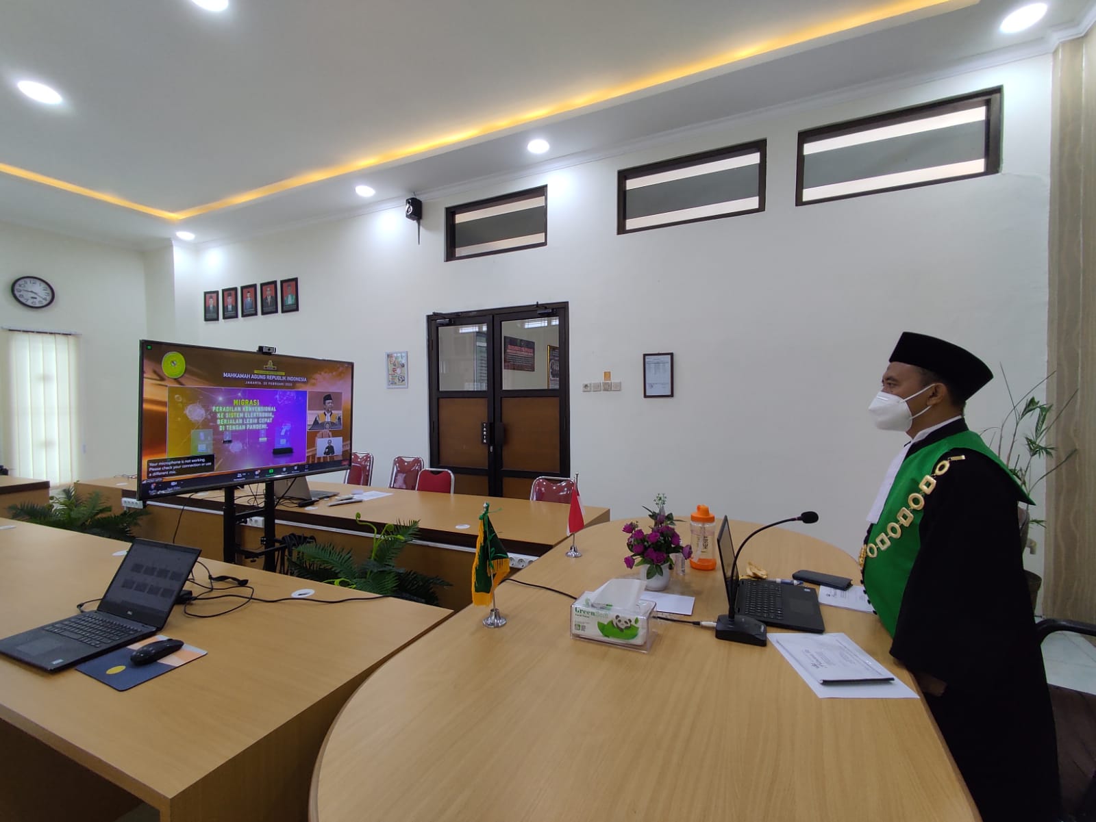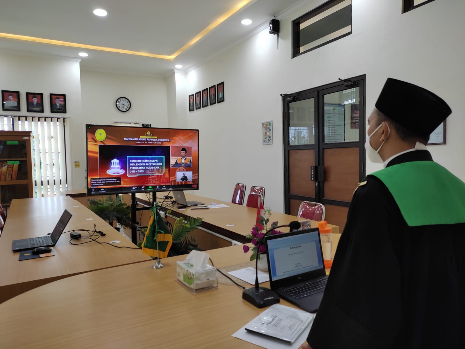 Selasa, 22 Februari 2022 - Ketua Pengadilan Agama Pemalang, Drs. H. Asrori, S.H., M.H. menghadiri acara Sidang Istimewa Laporan Tahunan Mahkamah Agung RI Tahun 2021 secara virtual dari Ruang Media Center Pengadilan Agama Pemalang. Acara tahunan kali ini diselenggarakan secara virtual karena masih dalam masa pandemi Covid-19, kegiatan tersebut diadakan langsung dari Gedung Mahkamah Agung RI di Jakarta dengan menerapkan protokol kesehatan yang ketat. Sidang Istimewa Laporan Tahunan Mahkamah Agung RI Tahun 2021 mengangkat tema " Akselerasi Perwujudan Peradilan Modern".