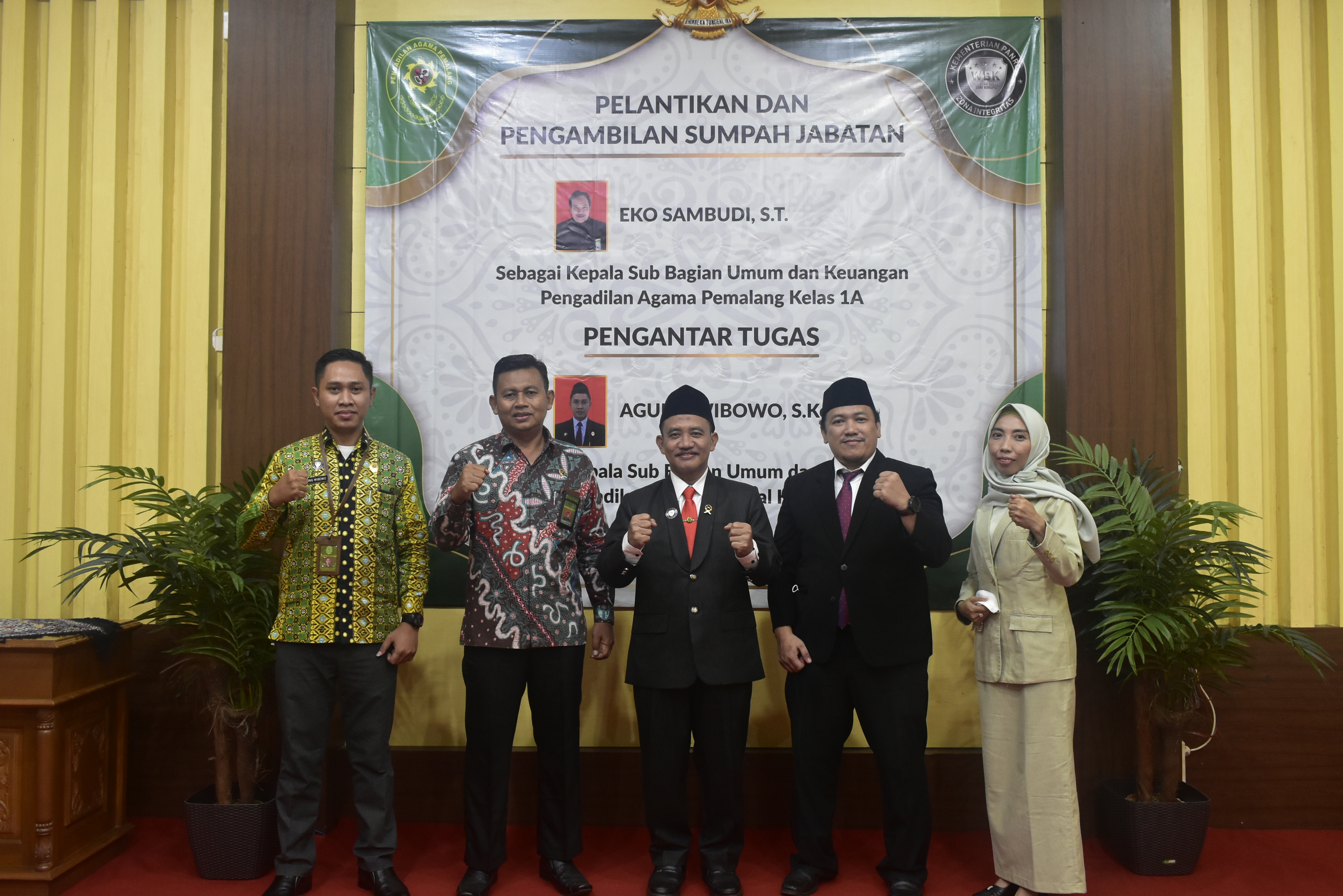 Pemalang, 24 Februari 2022. Pengadilan Agama Pemalang menyelenggarakan acara Pelantikan, dan Pengambilan Sumbah Jabatan, serta Pengantar Alih Tugas Kepala Sub Bagian Umum & Keuangan di Ruang Sidang Utama. Acara ini dimulai pada pukul 13.30 WIB dan dihadiri oleh jajaran pimpinan, para hakim, pejabat struktural dan fungsional, pegawai Pengadilan Agama Pemalang, tamu undangan serta keluarga Kasubbag yang dilantik.