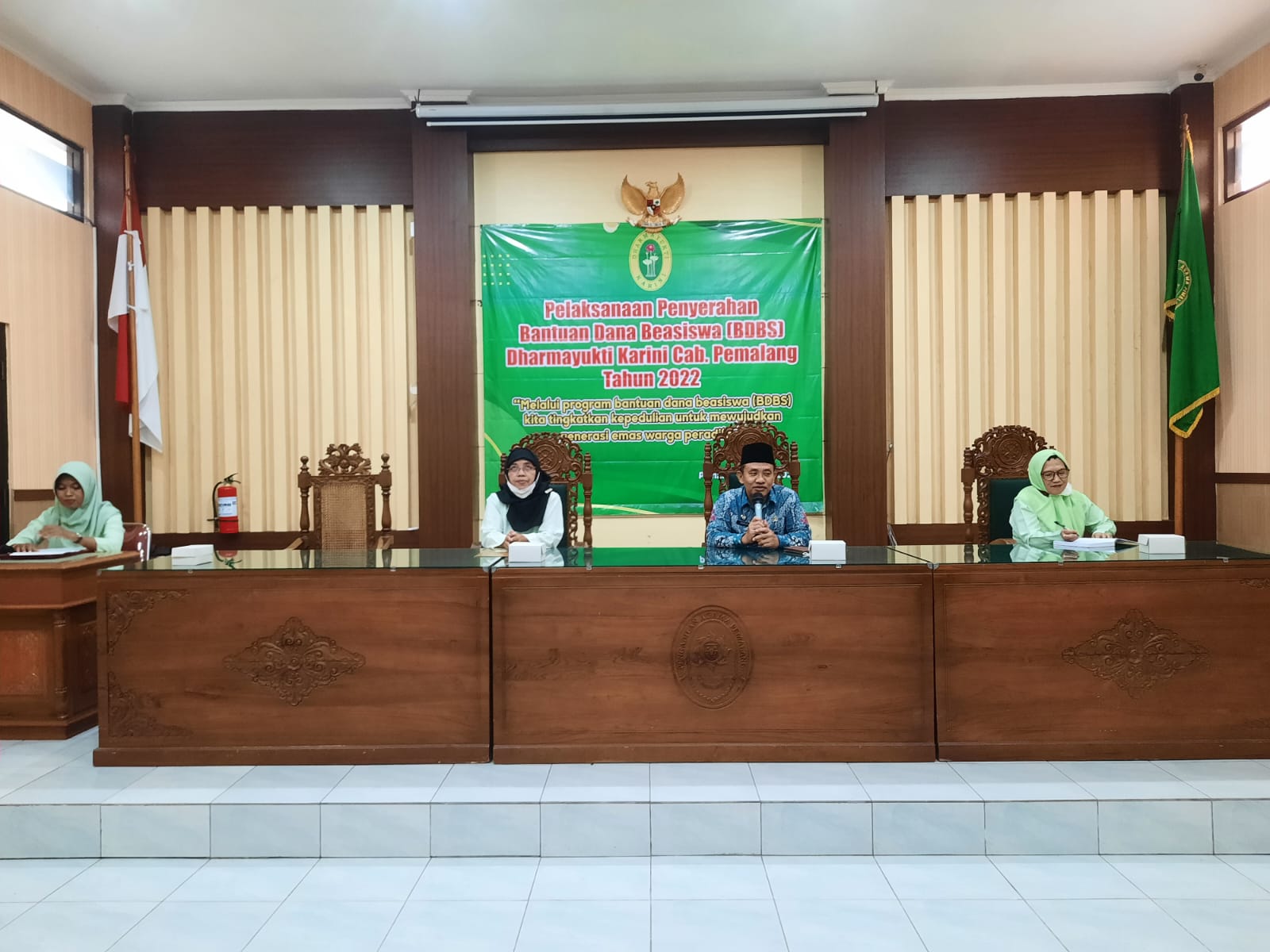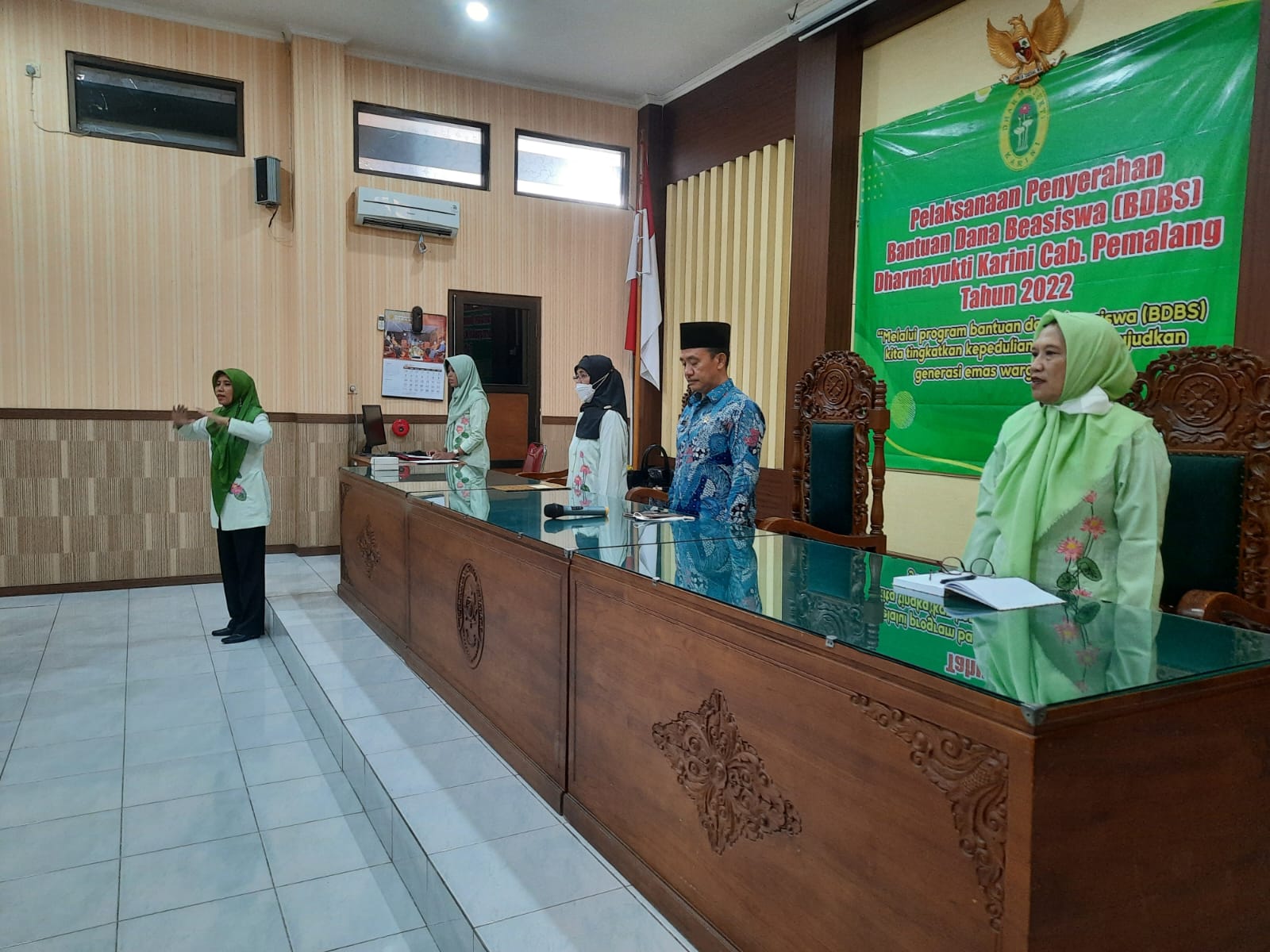 Pemalang – Jumat 22 Juli 2022, bertempat di Ruang Sidang Abu Bakar As Shiddiq Pengadilan Agama Pemalang, Dharmayukti Karini Cabang Pemalang melaksanakan acara Penyerahan Bantuan Dana Beasiswa (BDBS) kepada 12 orang pelajar yang berasal dari lingkungan Pengadilan Agama Pemalang dan Pengadilan Negeri Pemalang.