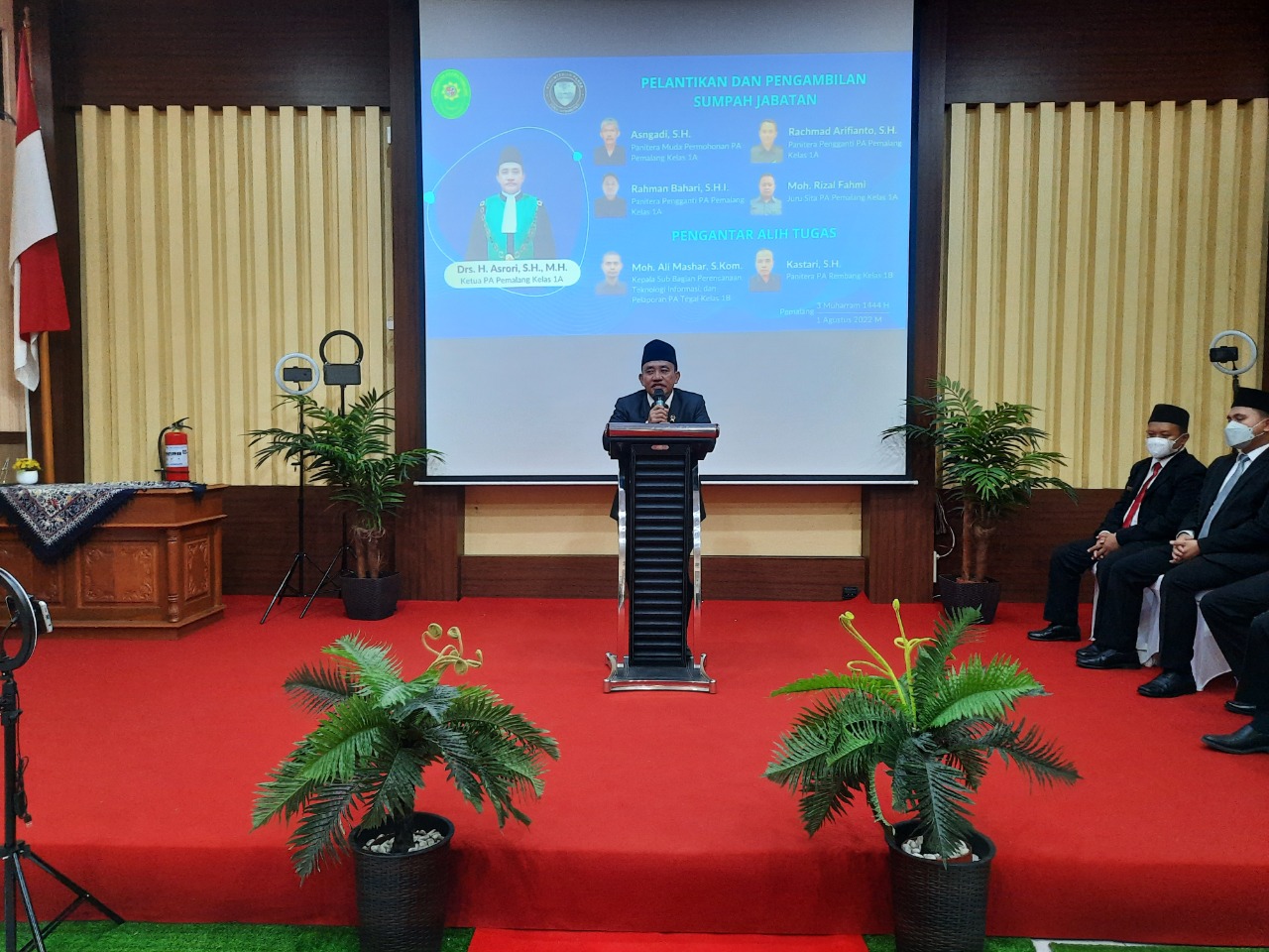 Dalam sambutannya Ketua Pengadilan Pengadilan Agama Pemalang Drs. H. Asrori, S.H., M.H. memberikan ucapan selamat datang kepada pejabat yang dilantik, beliau juga memberikan semangat untuk bersama-sama membangun Pengadilan Agama Pemalang agar lebih maju, beliau juga memberikan ucapan perpisahan dan permohonan maaf kepada pejabat yang beralih tugas.