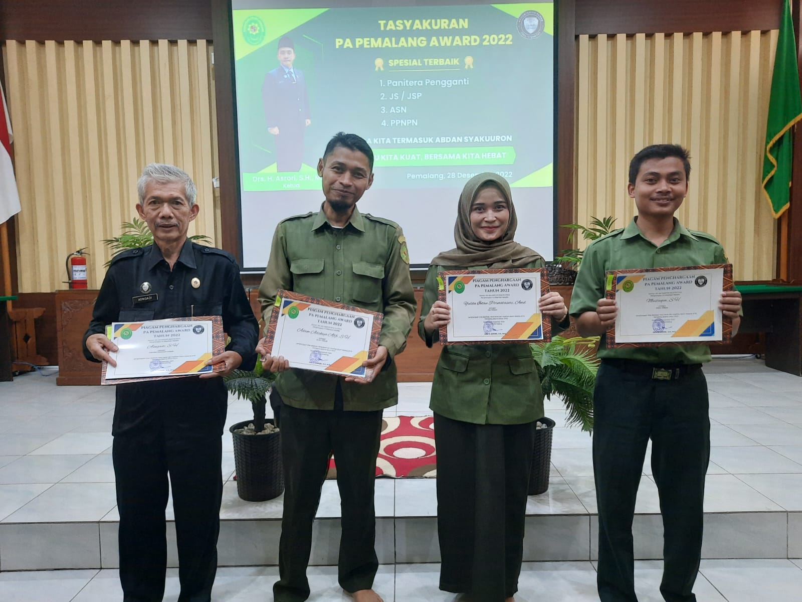 Pemalang, 28 Desember 2022. Di penghujung tahun 2022 Pengadilan Agama Pemalang Kelas 1A menyelenggarakan acara Tasyakuran dan Penganugerahan PA Pemalang Award 2022 sebagai bentuk rasa syukur atas pencapaian kinerja yang luar biasa selama tahun 2022, juga sebagai apresiasi bagi karyawan terpilih atas dedikasi, kerja keras dan loyalitas dalam bekerja di Pengadilan Agama Pemalang selama tahun 2022. Acara dilaksanakan di Ruang Sidang Abu Bakar Ash Shiddiq dan diikuti oleh seluruh aparatur Pengadilan Agama Pemalang.