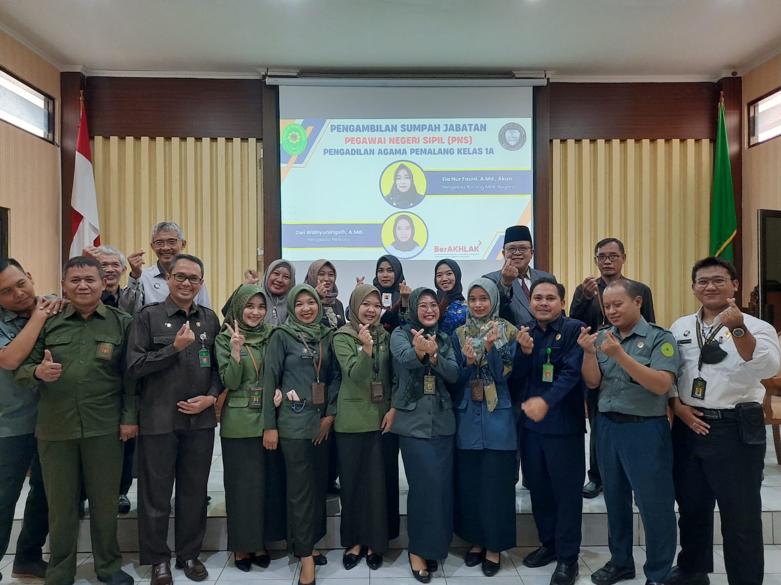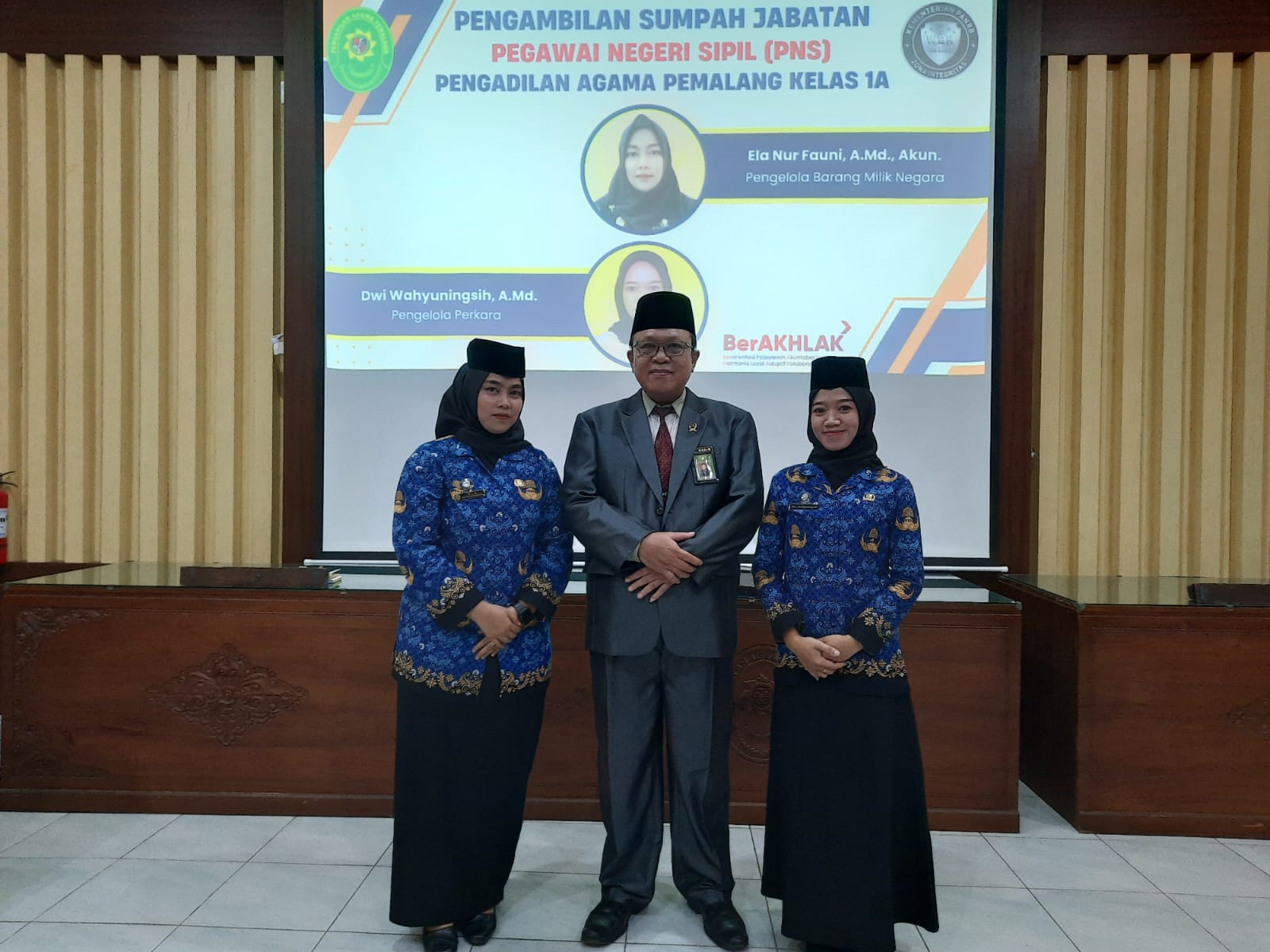 Pemalang, 01 Maret 2023. Bertempat di Ruang Sidang Abu Bakar As Shiddiq Pengadilan Agama Pemalang pagi ini pukul 08.00 WIB dilaksanakan Pengambilan Sumpah Jabatan Pegawai Negeri Sipil (PNS) kepada Ela Nur Fauni, A.Md. Akun. dan Dwi Wahyuningsih, A.Md. setelah keduanya dinyatakan lulus Pendidikan dan Pelatihan Dasar.