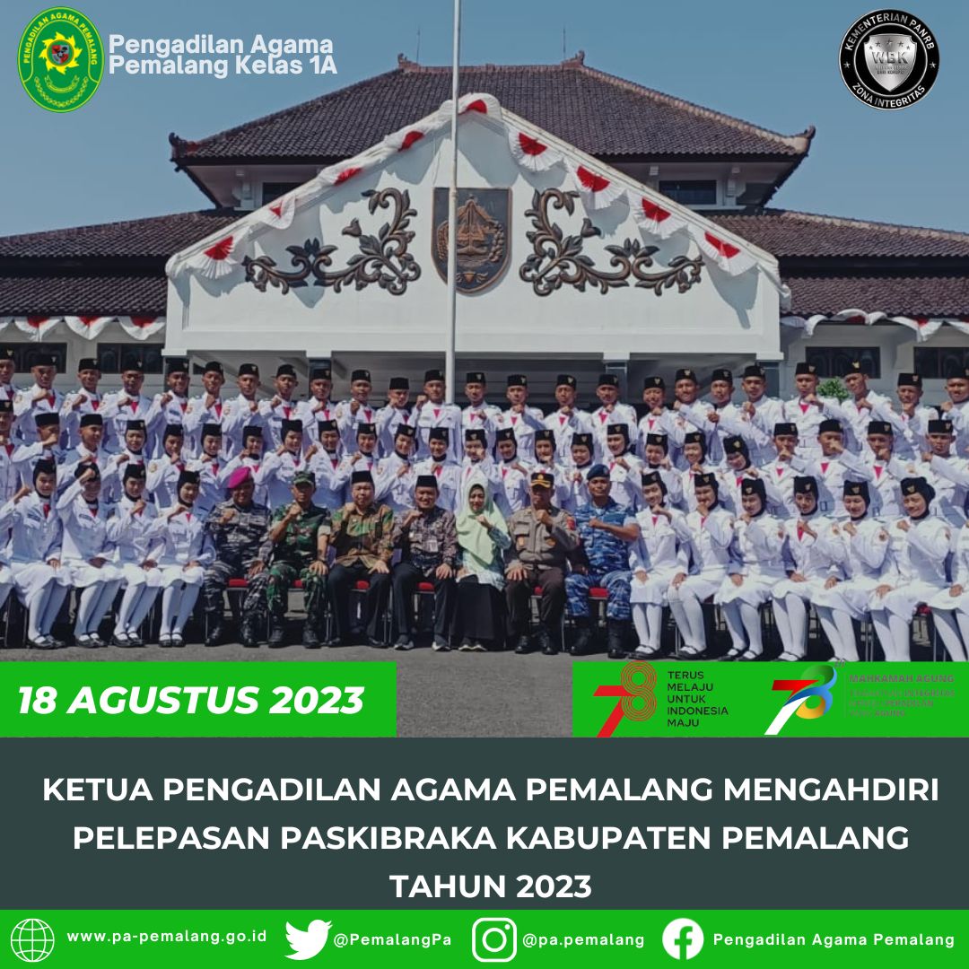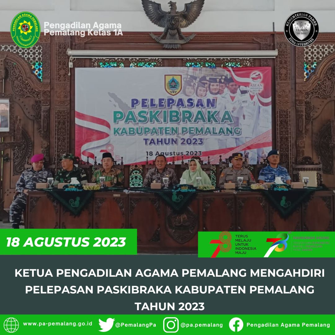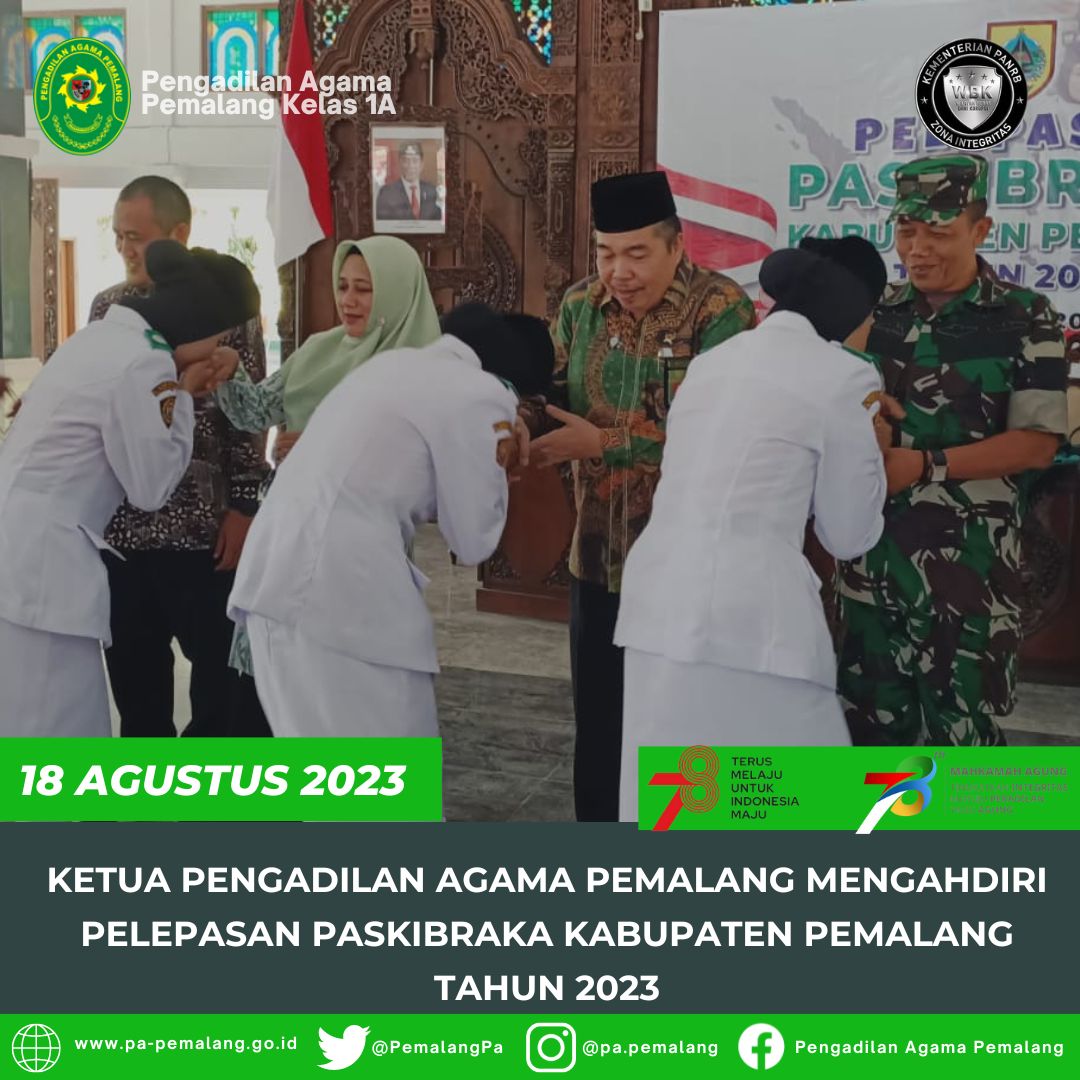 Ketua Pengadilan Agama Pemalang Solahuddin Sibagabariang, S.Ag., M.H menghadiri acara Pelepasan PASKIBRAKA Kabupaten Pemalang Tahun 2023 di Pendopo Kabupaten Pemalang.(EYK)