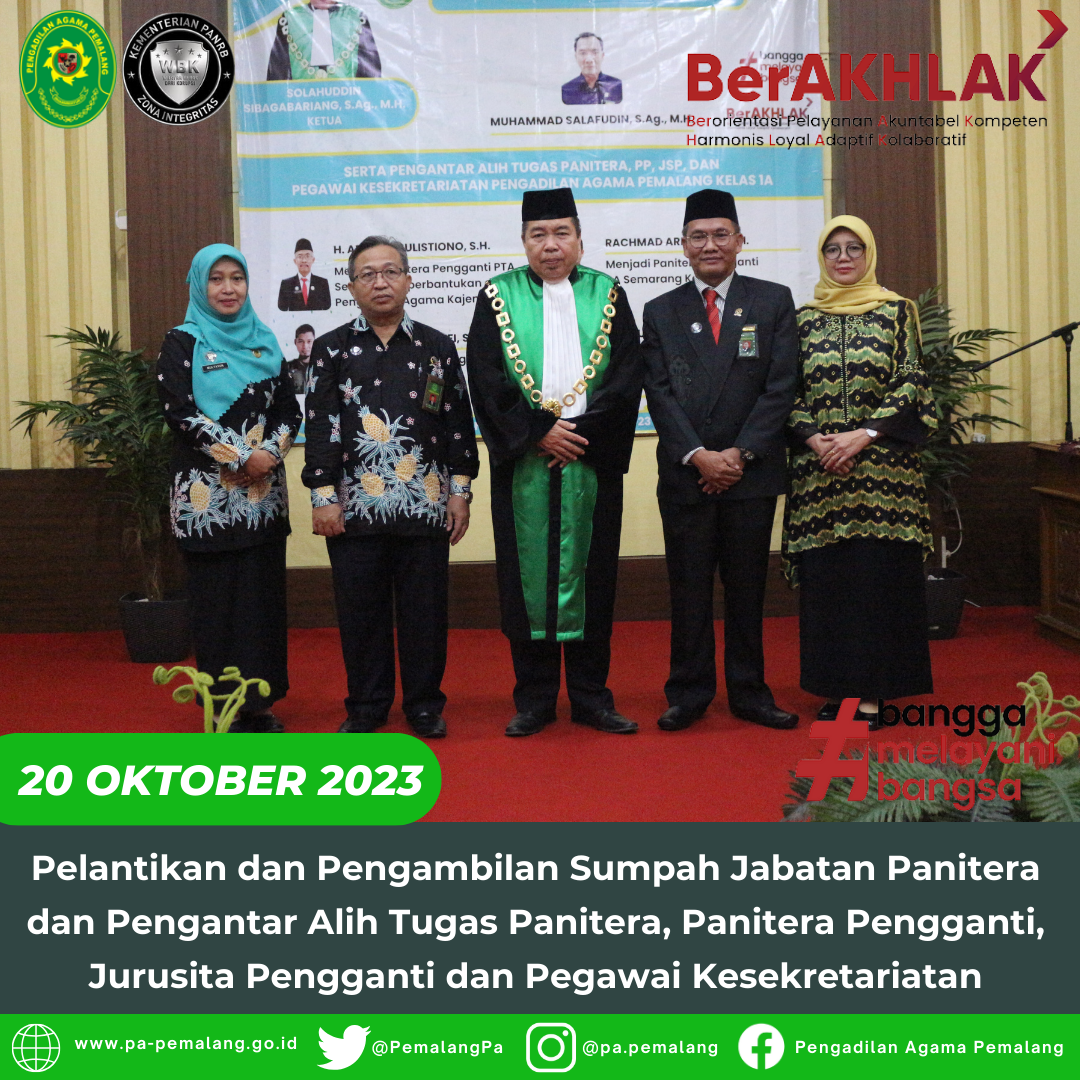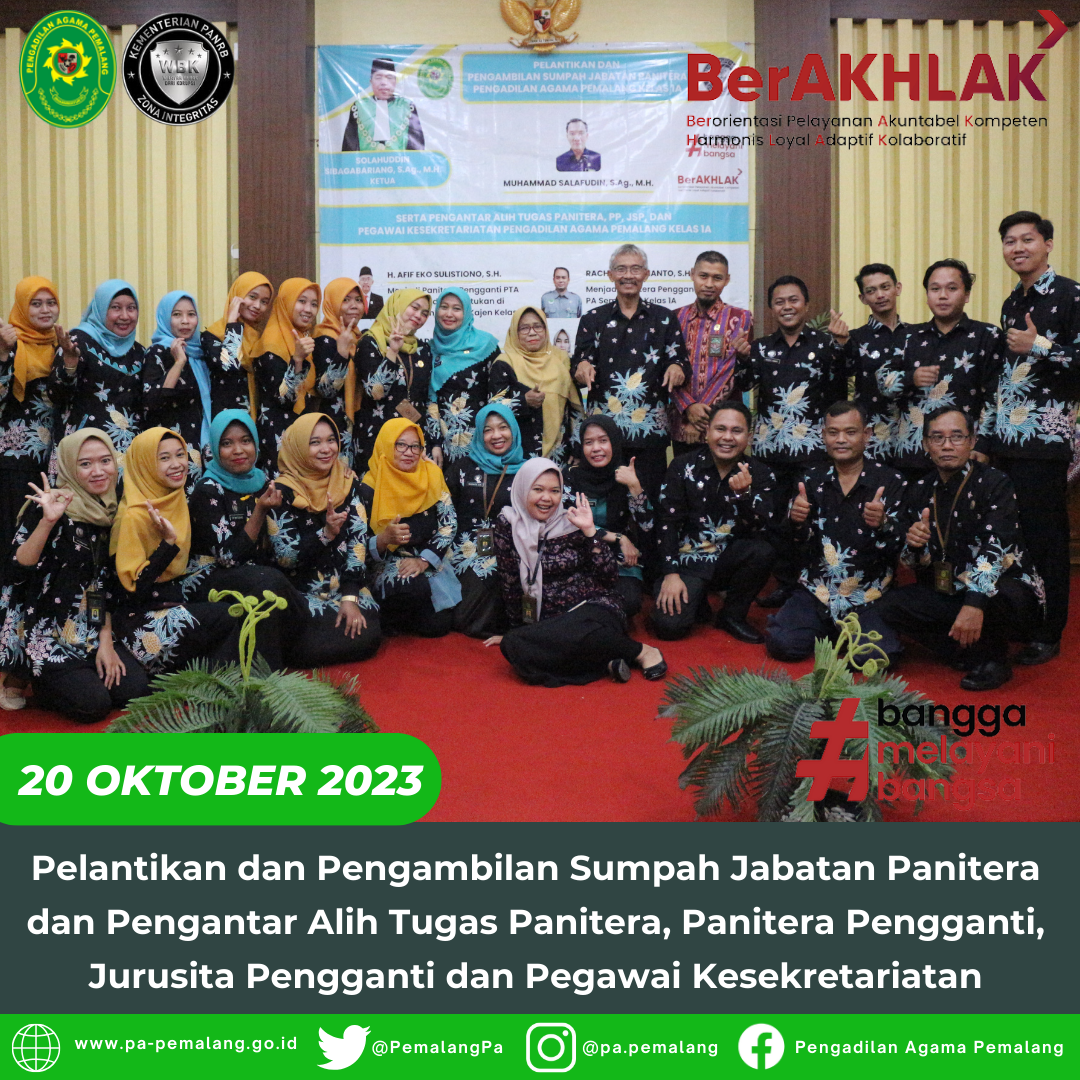Bertempat di Ruang Sidang Utama Abu Bakar Ash Shidiq pukul 9.00 di laksanakan Pelantikan dan Pengambilan Sumpah Jabatan Panitera Pengadilan Agama Pemalang Muhammad Salafudin, S.Ag.,M.H dan Pengantar Alih Tugas Panitera H. Afif Eko Sulistiono (menjadi Panitera Pengganti PTA Semarang yang di perbantukan di Pengadilan Agama Kajen), Panitera Pengganti Rachmad Arifianto, S.H(menjadi Panitera Pengganti Pengadilan Agama Semarang) , Jurusita Pengganti Adam Adzkiya Afifi, S.H (menjadi Panitera Pengganti Pengadilan Agama Batang) dan Pegawai Kesekretariatan Ela Nur Fauni, A.Md., Akun (menjadi Pengelola BMN Pengadilan Agama Slawi). (EYK)