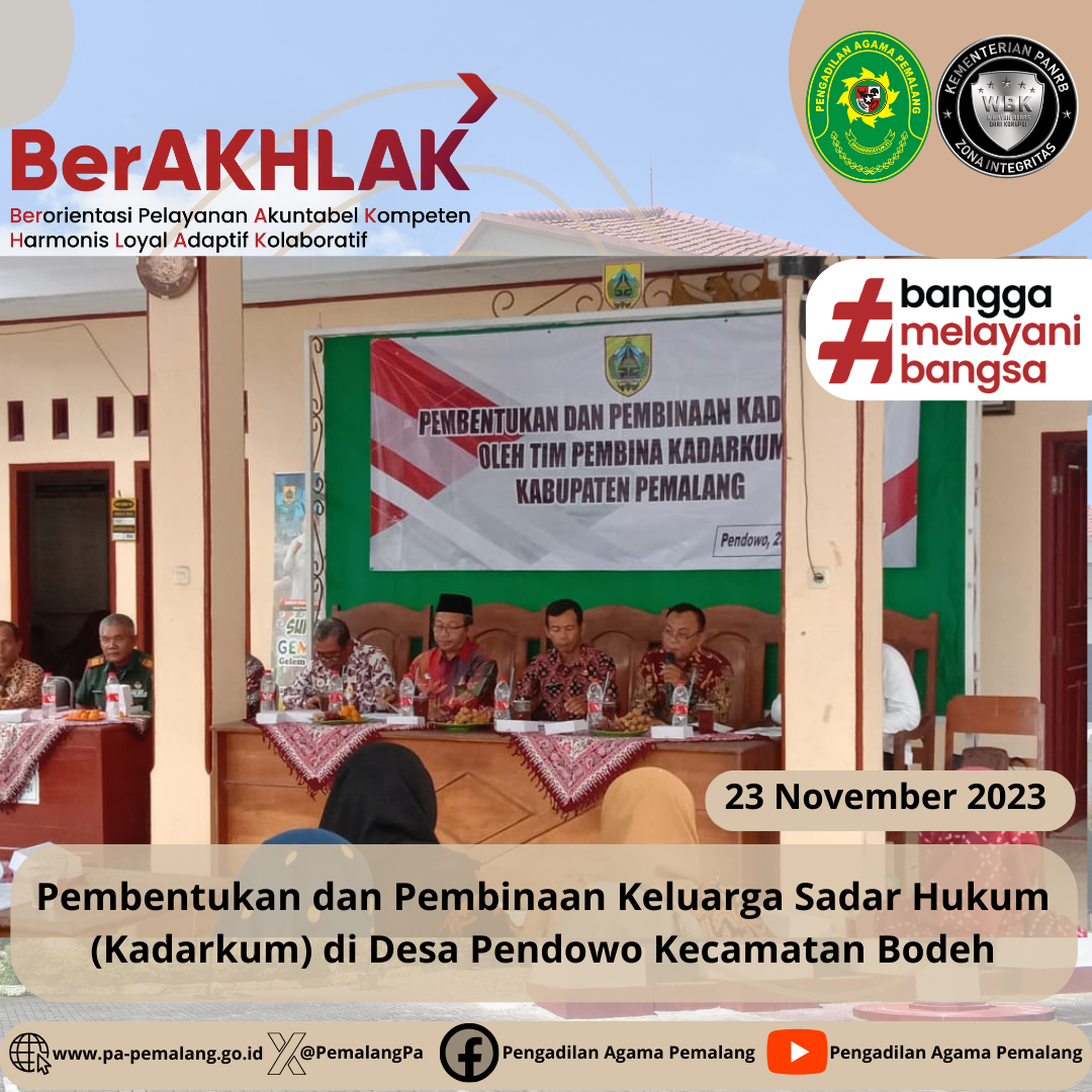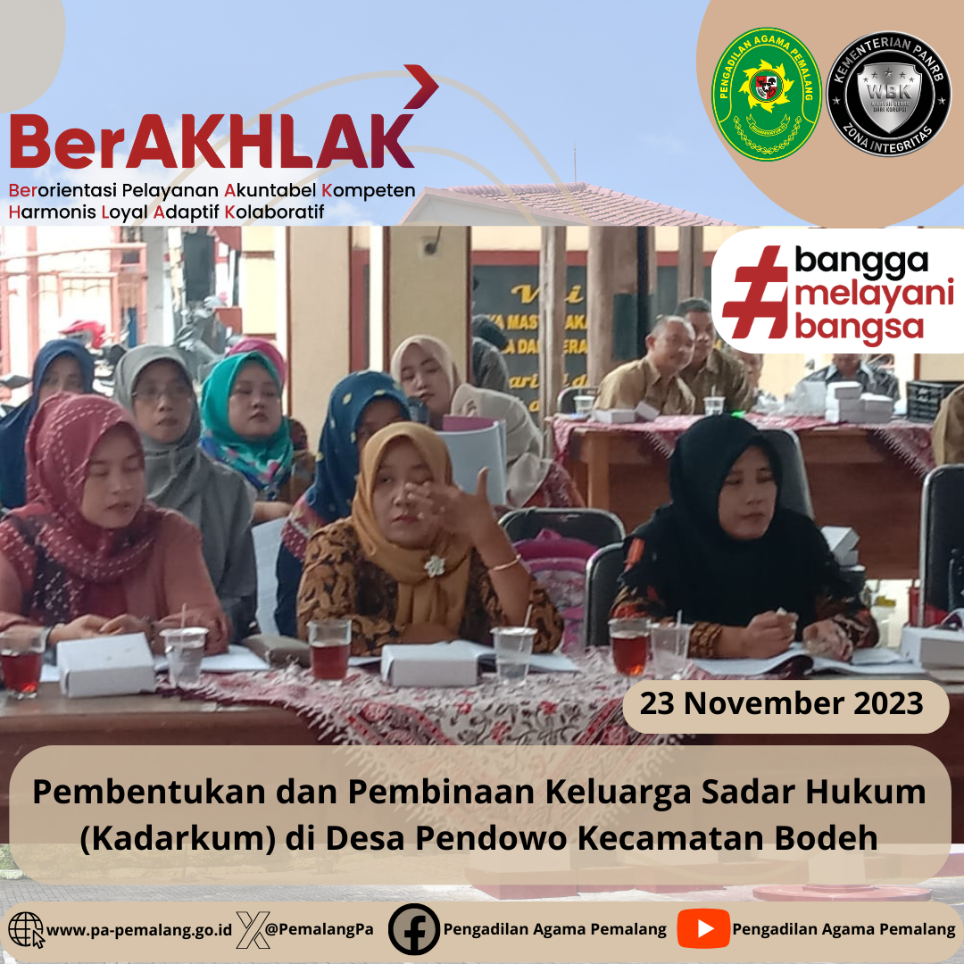 Mewakili Ketua Pengadilan Agama Pemalang, Wakil Ketua Pengadilan Agama Pemalang Drs. Husaini, S.H., M.H. menghadiri acara Keluarga Sadar Hukum (Kadarkum) di Desa Pendowo Kecamatan Bodeh yang difasilitasi oleh Bagian Hukum Pemerintah Kabupaten Pemalang.(EYK)