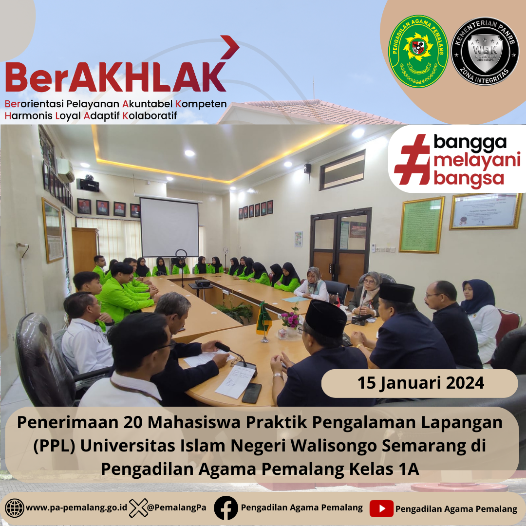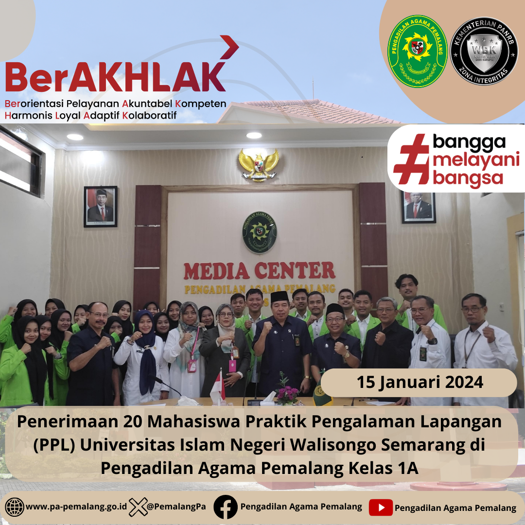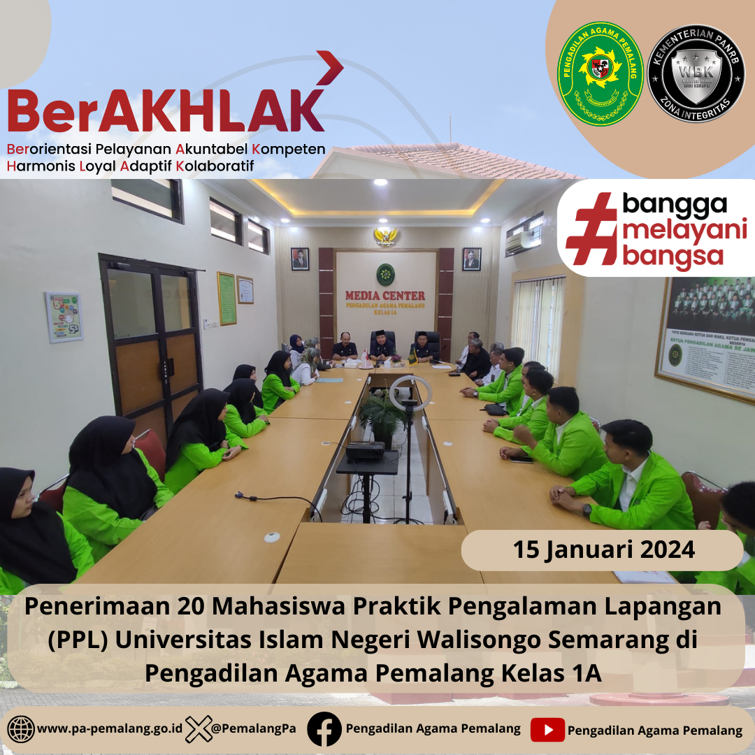 Bertempat di Ruang Media Center Pengadilan Agama Pemalang Kelas 1A, pagi ini pukul 09.00 WIB Ketua Pengadilan Agama Pemalang Solahuddin Sibagabariang, S.Ag., M.H. menerima penyerahan Mahasiswa dari Universitas Islam Negeri Walisongo Semarang. Pada kesempatan ini diserahkanlah mahasiswa sejumlah 20 orang. Dijelaskan bahwa kegiatan PPL (Praktik Pengalaman Lapangan) di Pengadilan Agama Pemalang ini akan dilaksanakan selama 10 hari dimulai dari tanggal 15 Januari 2024 hingga 26 Januari 2024.