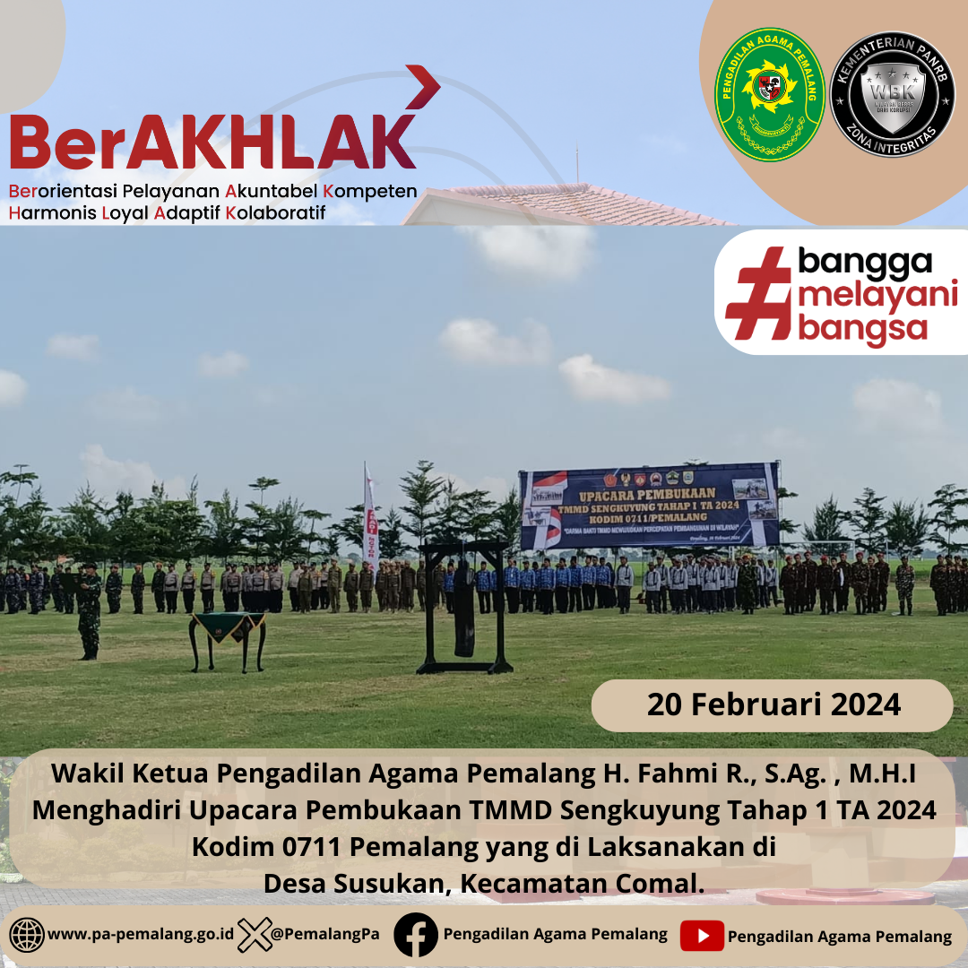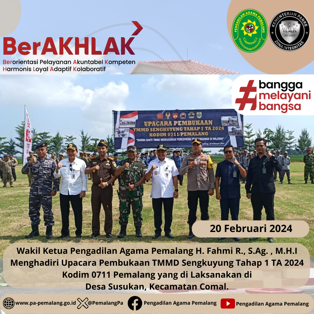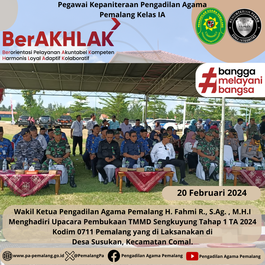 Wakil Ketua Pengadilan Agama Pemalang H. Fahmi R., S.Ag. , M.H.I Menghadiri Upacara Pembukaan TMMD Sengkuyung Tahap 1 TA 2024 Kodim 0711 Pemalang yang di Laksanakan di Desa Susukan, Kecamatan Comal.