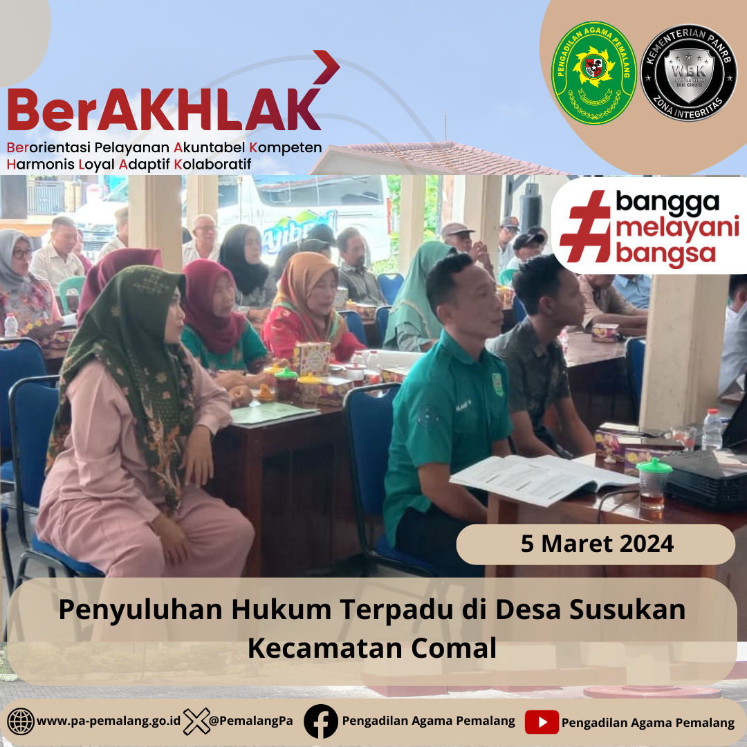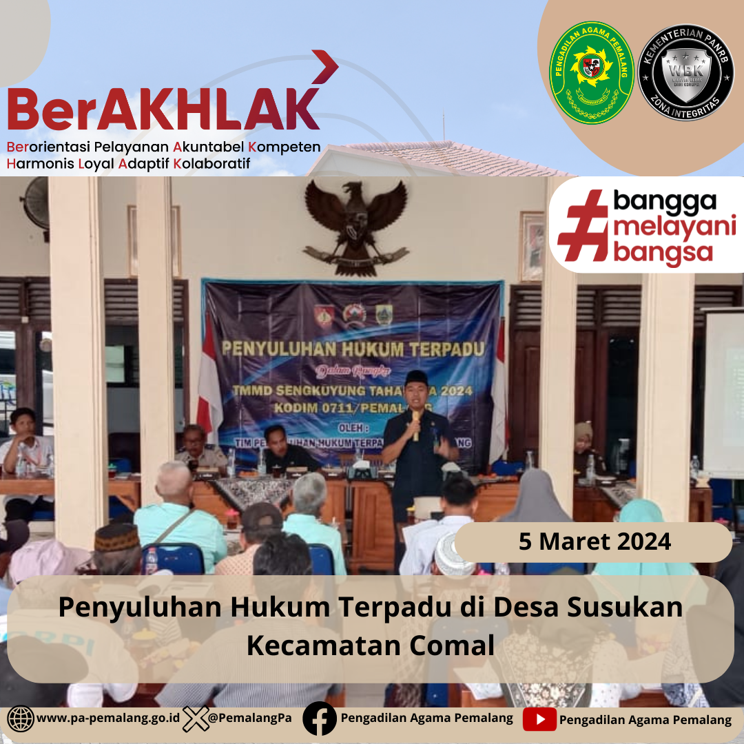 Wakil Ketua Pengadilan Agama Pemalang H. Fahmi R., S.Ag.,M.H.I mengikuti kegiatan Penyuluhan Hukum Terpadu di Desa Susukan Kecamatan Comal, Kabupaten Pemalang. Dalam Kesempatan ini Beliau Memperkenalkan kepada Masyarakat tentang berperkara secara elektronik atau E Court, Gugatan sederhana dan Mediasi.