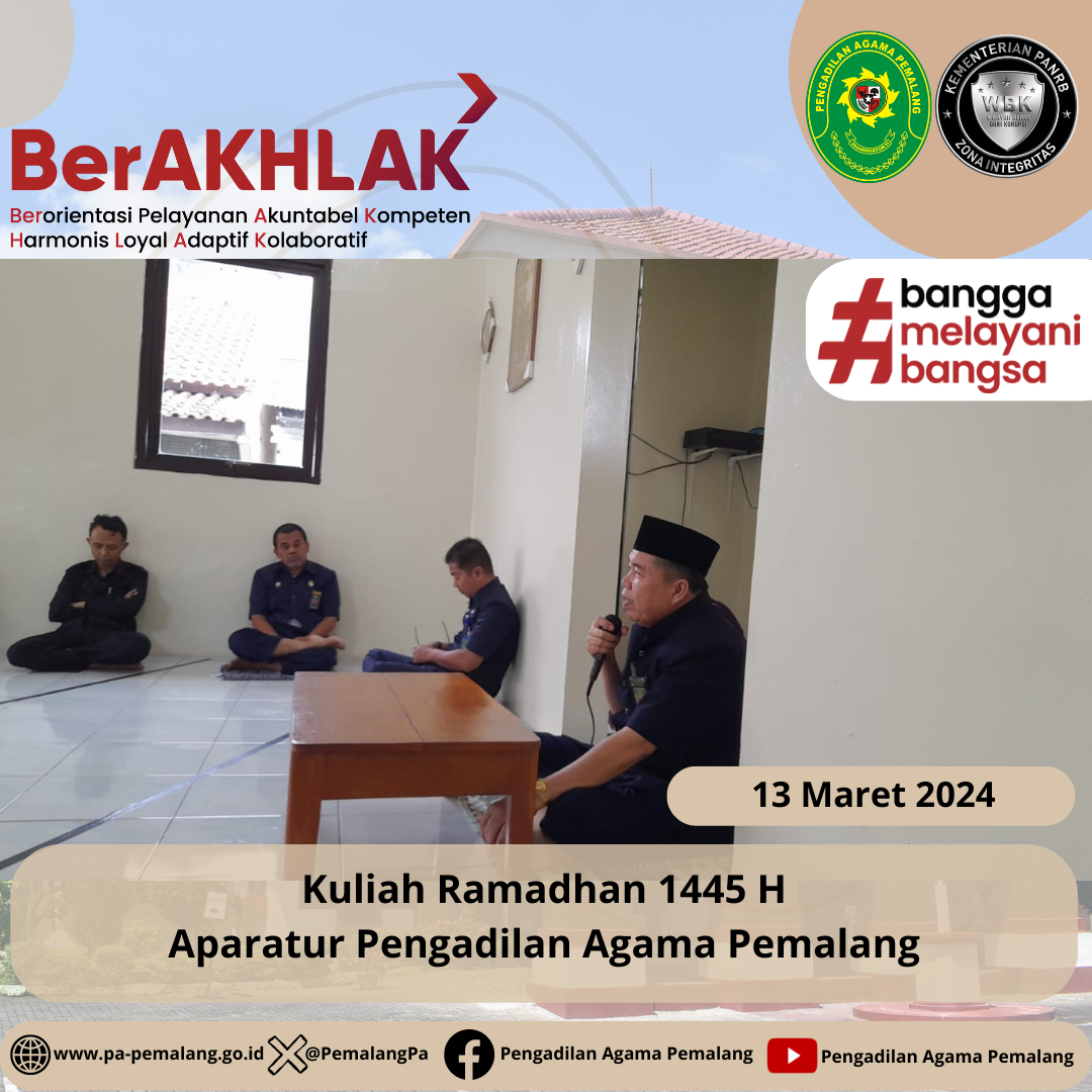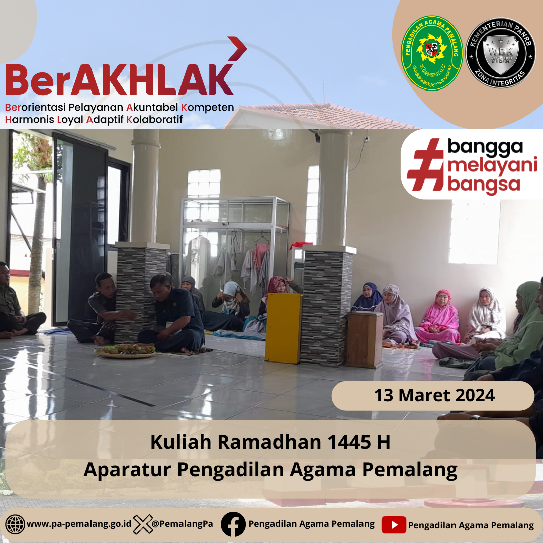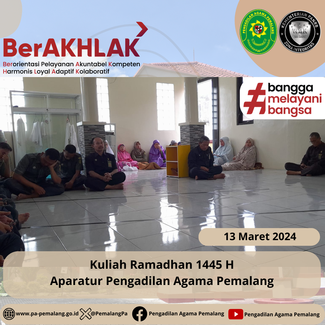 Seluruh Aparatur Pengadilan Agama Pemalang mengikuti kegiatan kuliah Ramadhan 1445 H yang di lakukan setelah melaksanakan sholat Dhuhur berjamaah. Pada Kesempatan ini bertindak sebagai pengisi kuliah Ramadhan adalah Ketua Pengadilan Agama Pemalang Solahuddin Sibagabariang, S.Ag.,M.H. Dalam pemaparanya beliau mengambil Tema Ramadlan yg Penuh Berkah. Bagaimana kita setiap muslim dalam menyambut bulan suci Ramadhan, mengisi dengan hal hal positif dan tentunya meningkatkan ibadah di Bulan yang Suci ini.