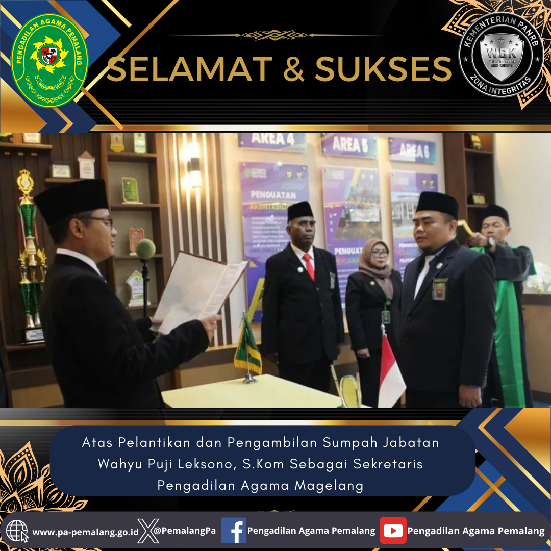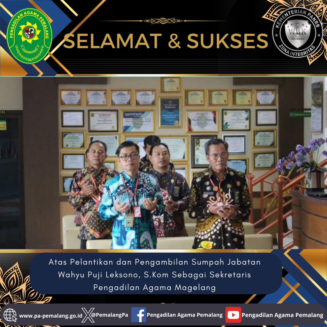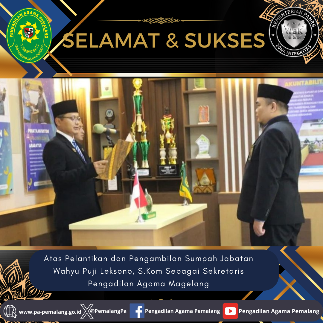 Keluarga besar Pengadilan Agama Pemalang Kelas IA mengucapkan selamat dan sukses atas Pelantikan dan Pengambilan Sumpah Jabatan Wahyu Puji Leksono, S.Kom Sebagai Sekretaris Pengadilan Agama Magelang.
