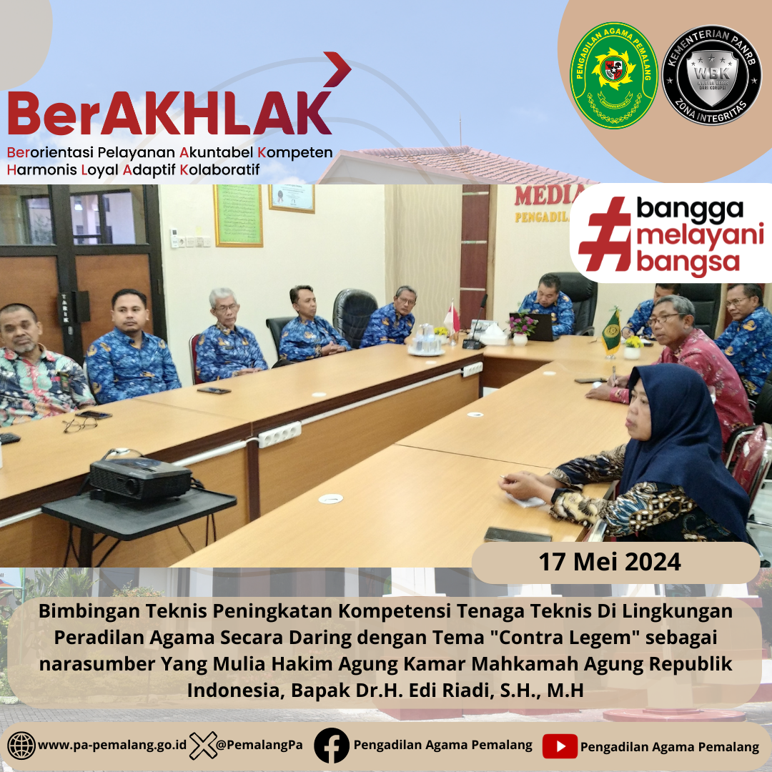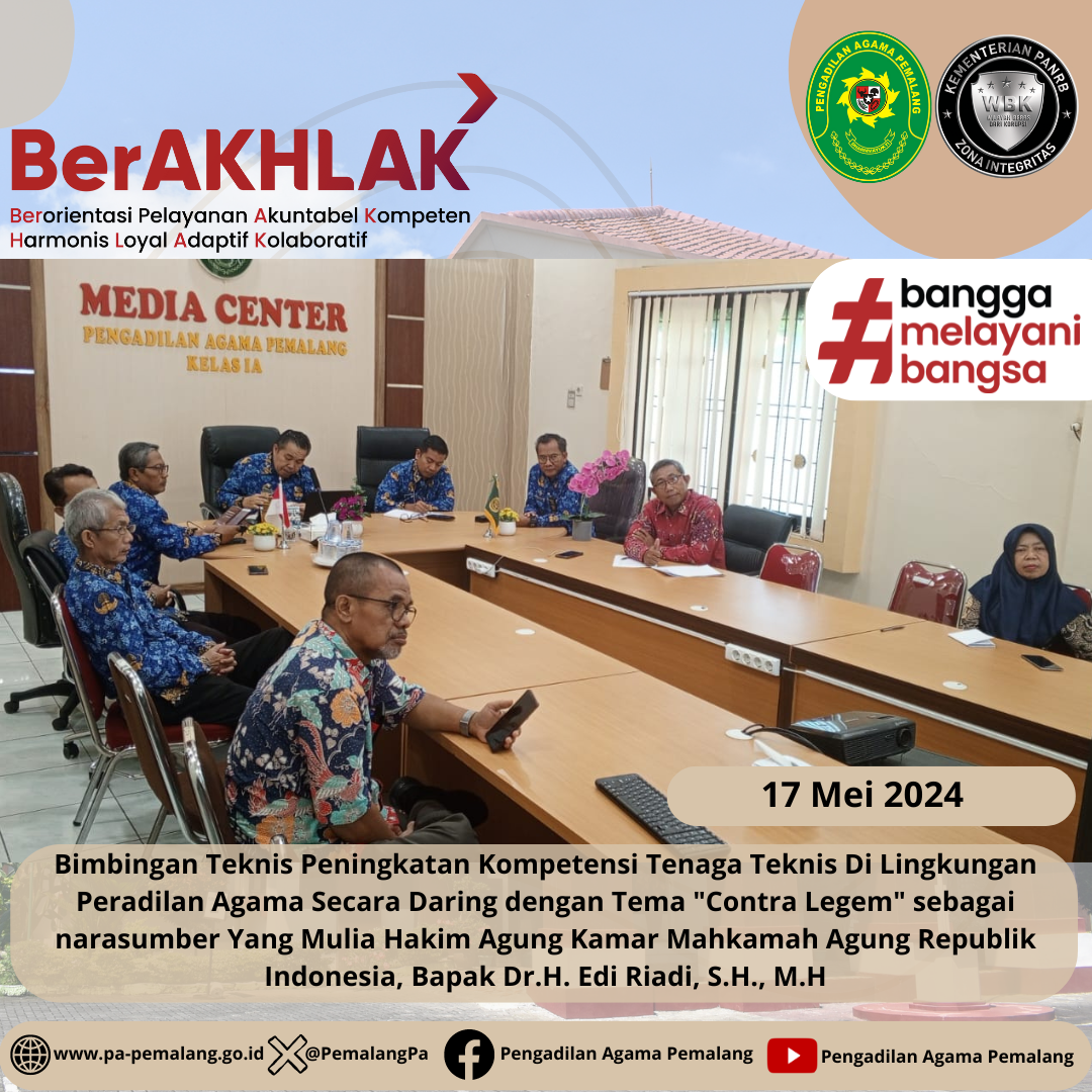 Bertempat di Ruang Media Center Pengadilan Agama Pemalang Ketua, Wakil Ketua, Hakim, Panitera, Panitera Muda, Serta Staf Pengadilan Agama Pemalang mengikuti Bimbingan Teknis Peningkatan Kompetensi Tenaga Teknis Di Lingkungan Peradilan Agama Secara Daring dengan Tema "Contra Legem" sebagai narasumber Yang Mulia Hakim Agung Kamar Mahkamah Agung Republik Indonesia, Bapak Dr.H. Edi Riadi, S.H., M.H.