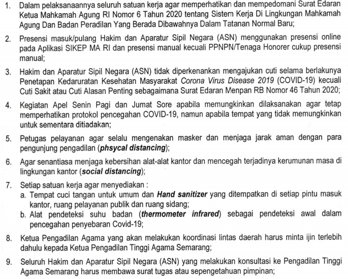 Kemudian dilanjutkan dengan menyampaikan isi surat dari PTA Semarang perihal “Sistem Kerja dalam Tatanan Normal Baru” meliputi :