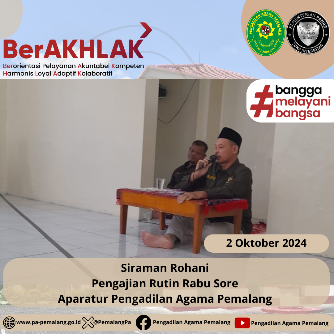 Pengajian Rutin Rabu Sore tanggal 2 Oktober 2024 yang di adakan di Mushola Al Mahkamah setelah sholat Ashar berjamaah. Pada kali ini bertindak sebagai Pengisi Kajian adalah Hakim Pengadilan Agama Pemalang Drs. AH. Fudloli.M.H Pada Kesempatan ini beliau menyampaikan tentang Bulan Robiul Awal bulan kelahiran Nabi Muhammad Shallallahu `alaihi Wa Sallam.