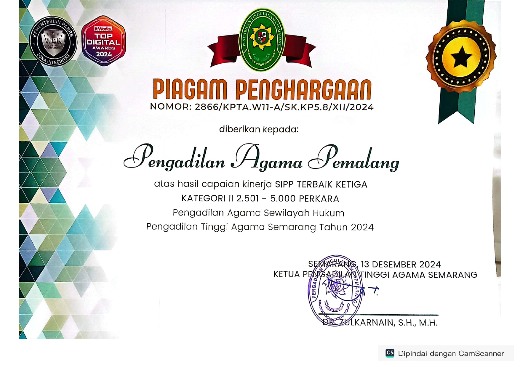 1. Terbaik Ke 3 Pencapaian Kinerja Terbaik SIPP Kategori II 2501 - 5000 Perkara