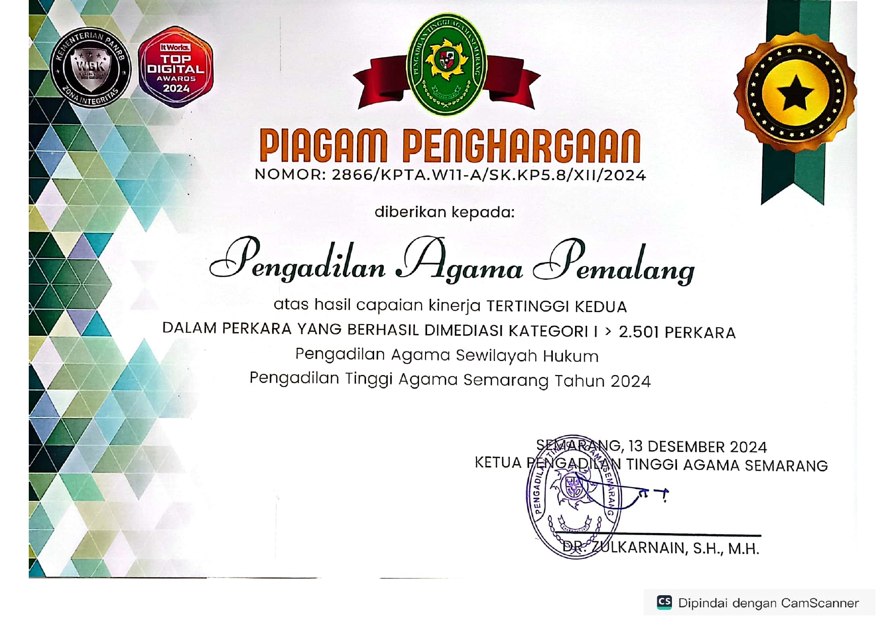Acara kemudian dilanjutkan dengan pemberian penghargaan pada satuan kerja yang berprestasi. Pada kesempatan kali ini Pengadilan Agama Pemalang meraih beberapa Penghargaan Antara lain :