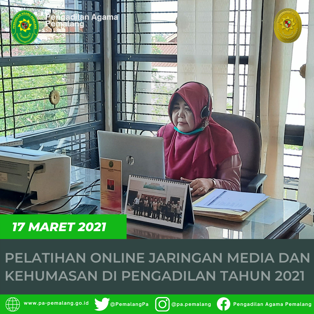 Pemalang, 17 Maret 2021. Hakim Pengadilan Agama Pemalang ibu Dra. Hj. Sri Rokhmani, M.H.I., mengikuti Pelatihan Online Jaringan Media dan Kehumasan di Pengadilan Tahun 2021 pada Pusdiklat Manajemen dan Kepemimpinan Badan Litbang Diklat Kumdil Mahkamah Agung RI yang bekerjasama dengan London School of Public Relations (LSPR) Tahun Anggaran 2021. Pelatihan ini dilaksanakan dari tanggal 15 Maret 2021 s.d 19 Maret 2021 yang yang diikuti oleh 206 peserta yang dibagi menjadi dua kelas per harinya. Untuk kelas pagi dimulai dari pukul 08.30 WIB s.d 10.30 WIB dan untuk kelas siang dimulai dari pukul 13.30 WIB s.d 15.30 WIB. (YulitaIntan)
