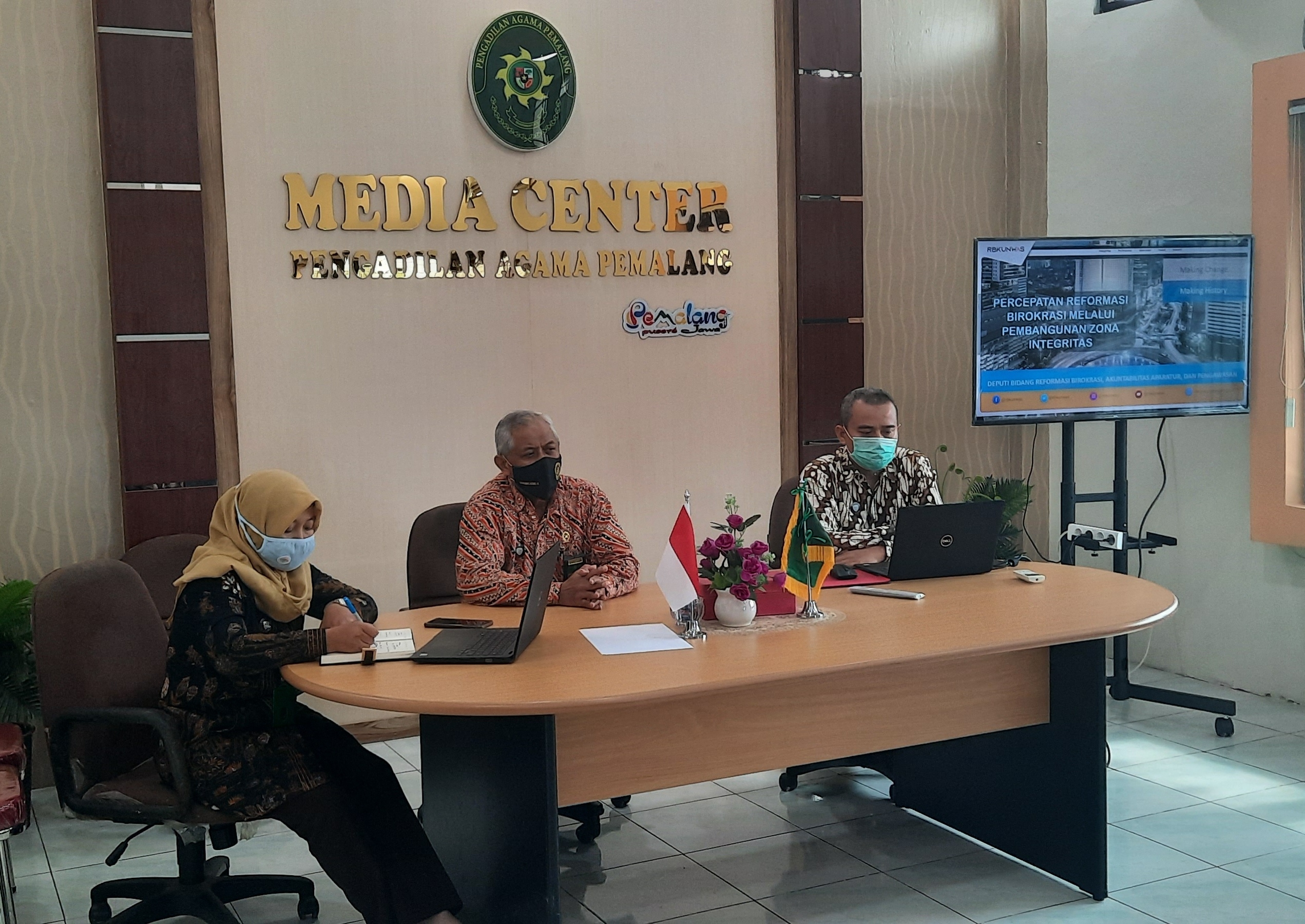 Pemalang Jumat 26 Maret 2021. Sebagai salah satu upaya dari Pengadilan Agama Pemalang dalam mewujudkan WBBM (Wilayah Birokrasi Bersih dan Melayani), hari ini pukul 14.00 WIB diselenggarakan sosialisasi budaya WBBM yang diikuti oleh seluruh PPNPN (Pegawai Pemerintah Non Pegawai Negeri) Pengadilan Agama Pemalang. Acara ini diselenggarakan di ruang media center dengan pembicara PLT Ketua Pengadilan Agama Pemalang Bapak Drs. H. Djuwadi, S.H, M.H, Sektretaris Pengadilan Agama Pemalang Ibu Mulyatun, S.H , Kepala Sub Bagian Perencanaan Teknologi Informasi dan Pelaporan Bapak H. Ahmad Ali Syahbana, S.E, S.T, M.M dan Kepala Sub Bagian Kepegawaian, Organisasi, Dan Tata Laksana Bapak Slamet S.Ag., M.H. Adapun tujuan dari kegiatan ini adalah untuk memberi pengarahan kepada seluruh PPNPN Pengadilan Agama Pemalang agar lebih meningkatkan pelayanan kepada masyarakat dari segala sisi. Mulai dari pelayanan pada pintu masuk yang dipegang oleh security, pelayanan parkir, pelayanan resepsionis, pelayanan kebersihan, pelayanan petugas PTSP (Pelayanan Terpadu Satu Pintu) dll. Diharapkan dengan diselenggarakannya sosialisasi ini seluruh pegawai Pengadilan Agama Pemalang baik PNS maupun PPNPN bisa memberikan pelayanan yang excellent bagi para pencari keadilan dan mewujudkan Pengadilan Agama Pemalang sebagai Pengadilan yang meraih predikat WBBM (Wilayah Birokrasi Bersih dan Melayani). (YulitaIntan)